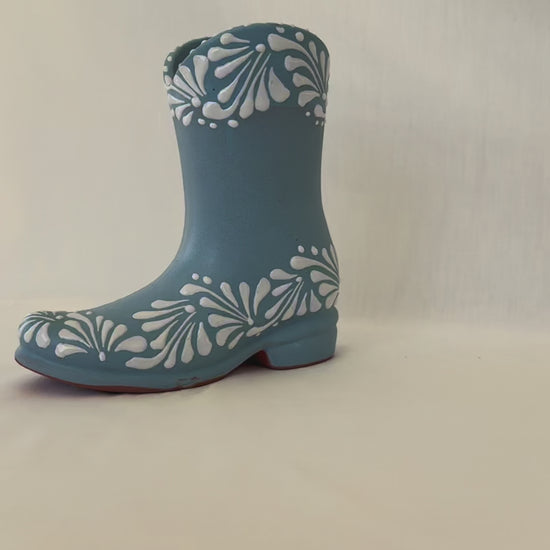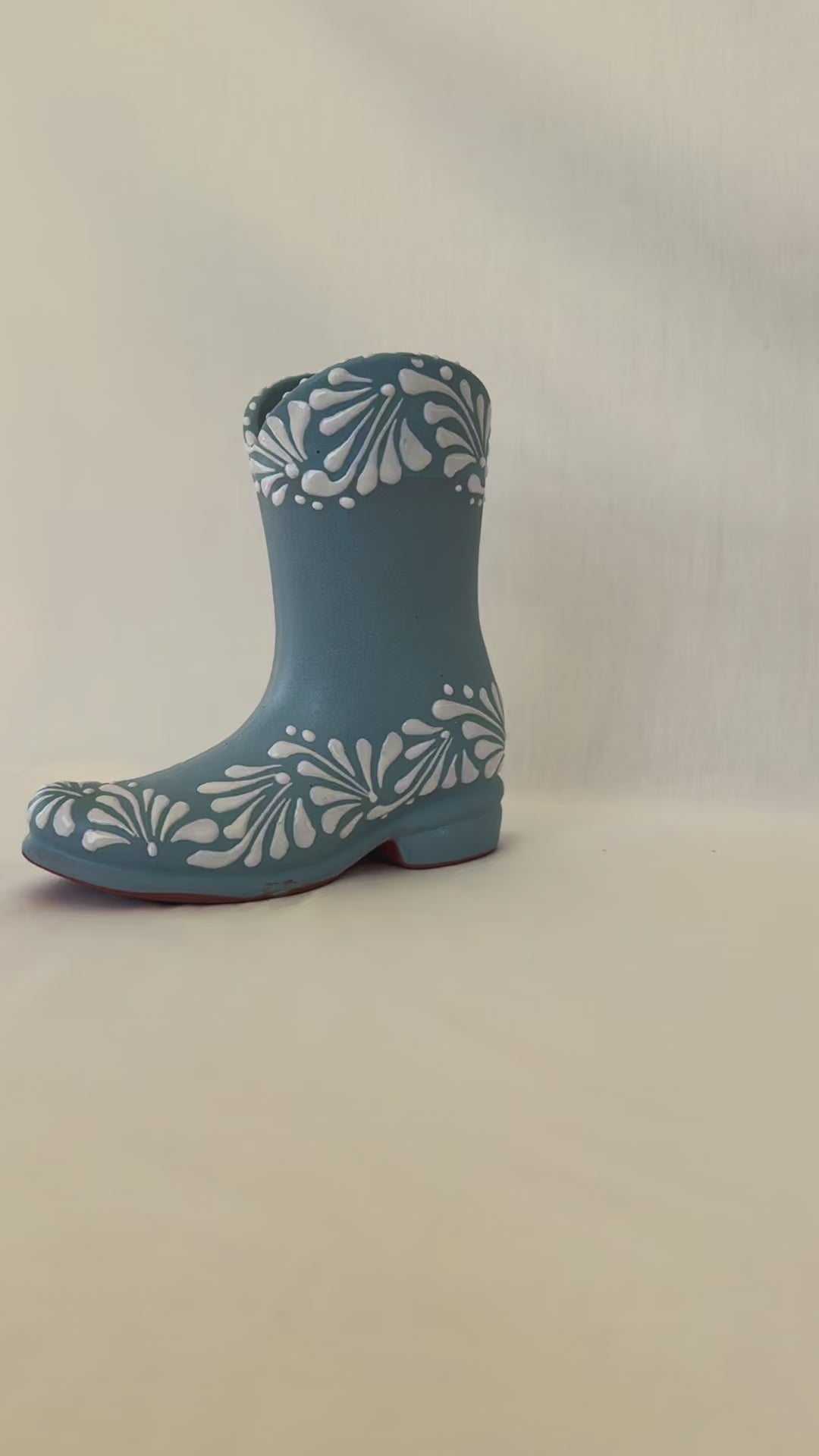 Baby blue boot vase with white design. Partial burst design. 7” tall