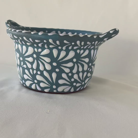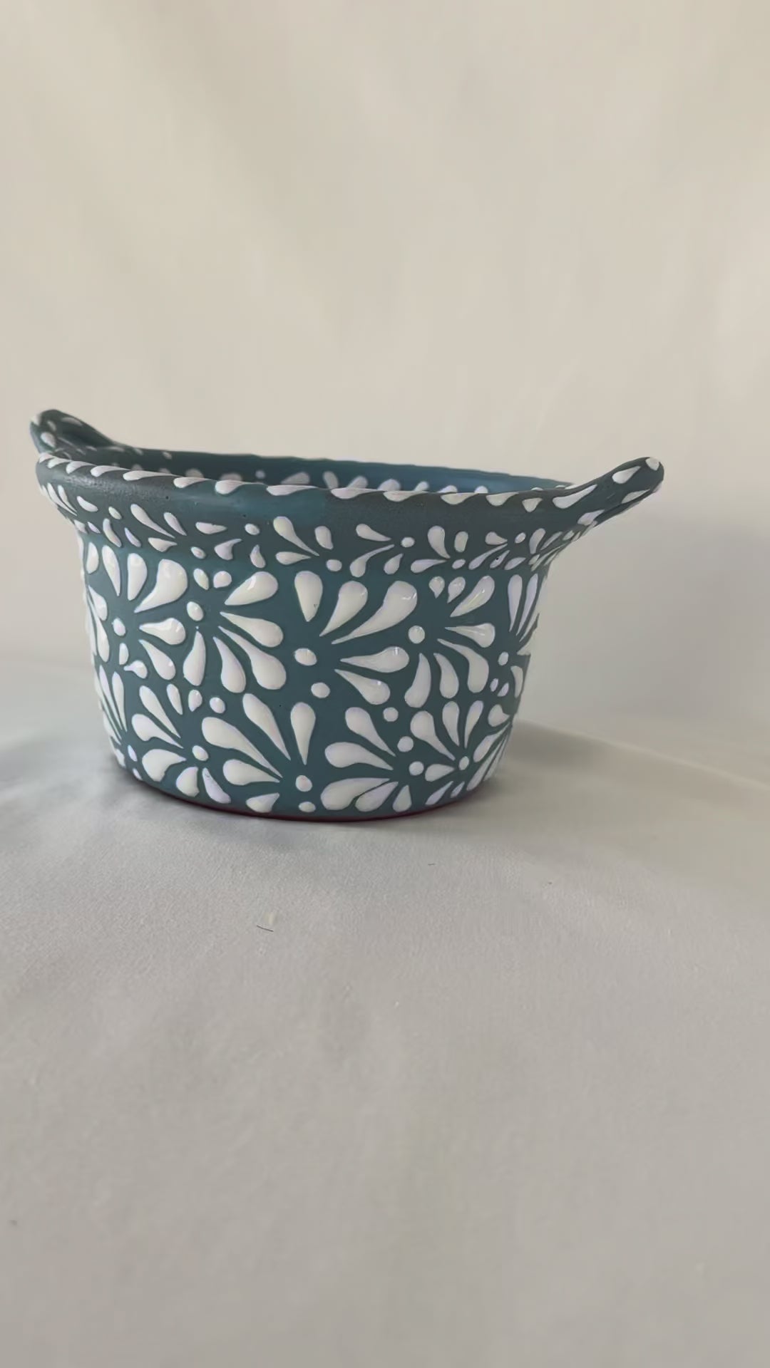 Baby blue cazuela with white design. Fan design. 4” tall. 7” wide. Holds ~32 fl. oz.
