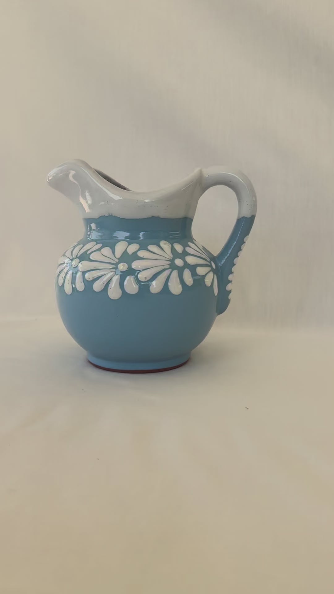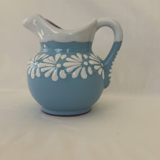 Baby blue small pitcher with white design. Burst design. White rim. 6 1/2” tall. 6 1/2” wide. Holds 32 fl. oz.