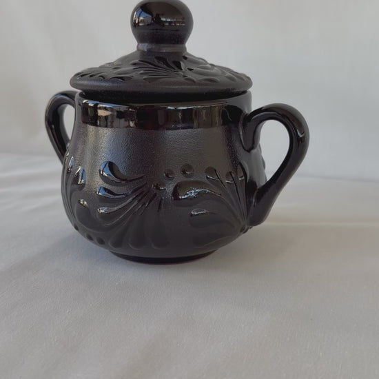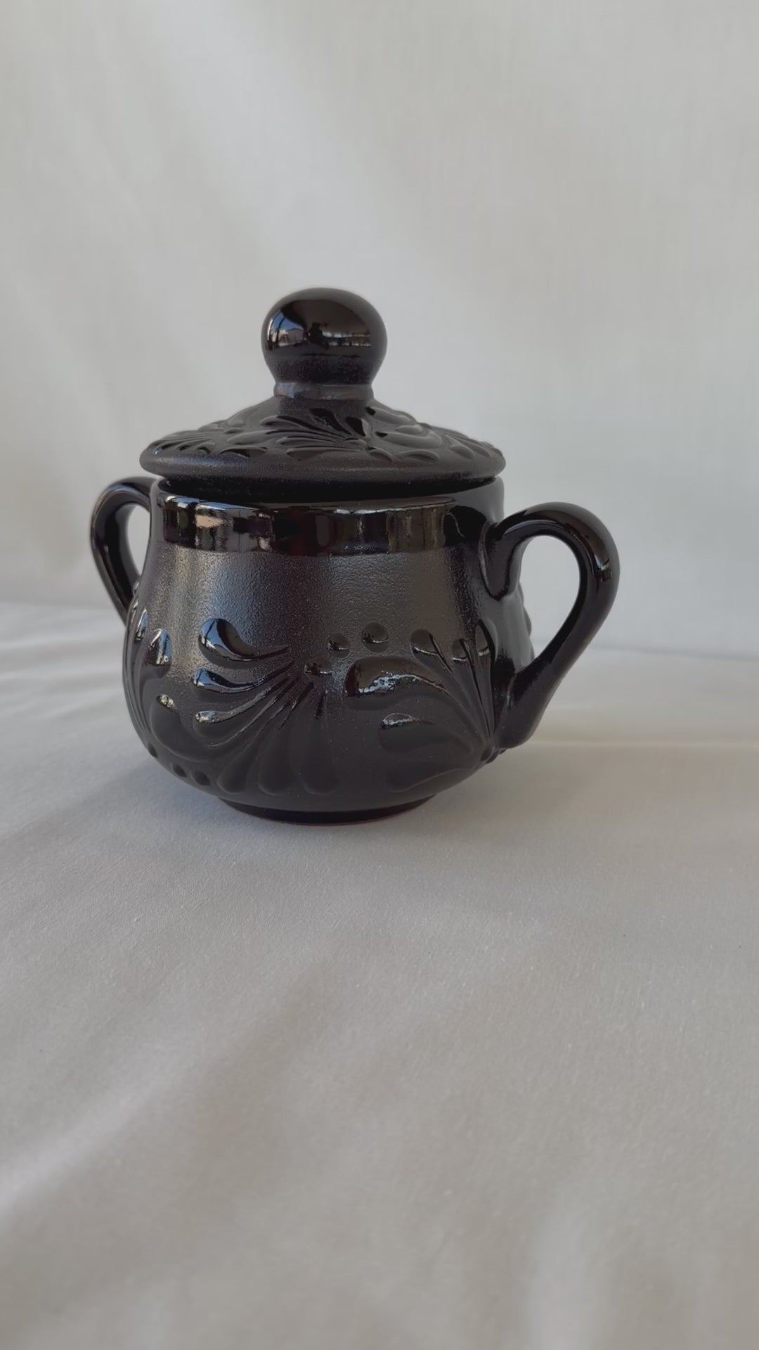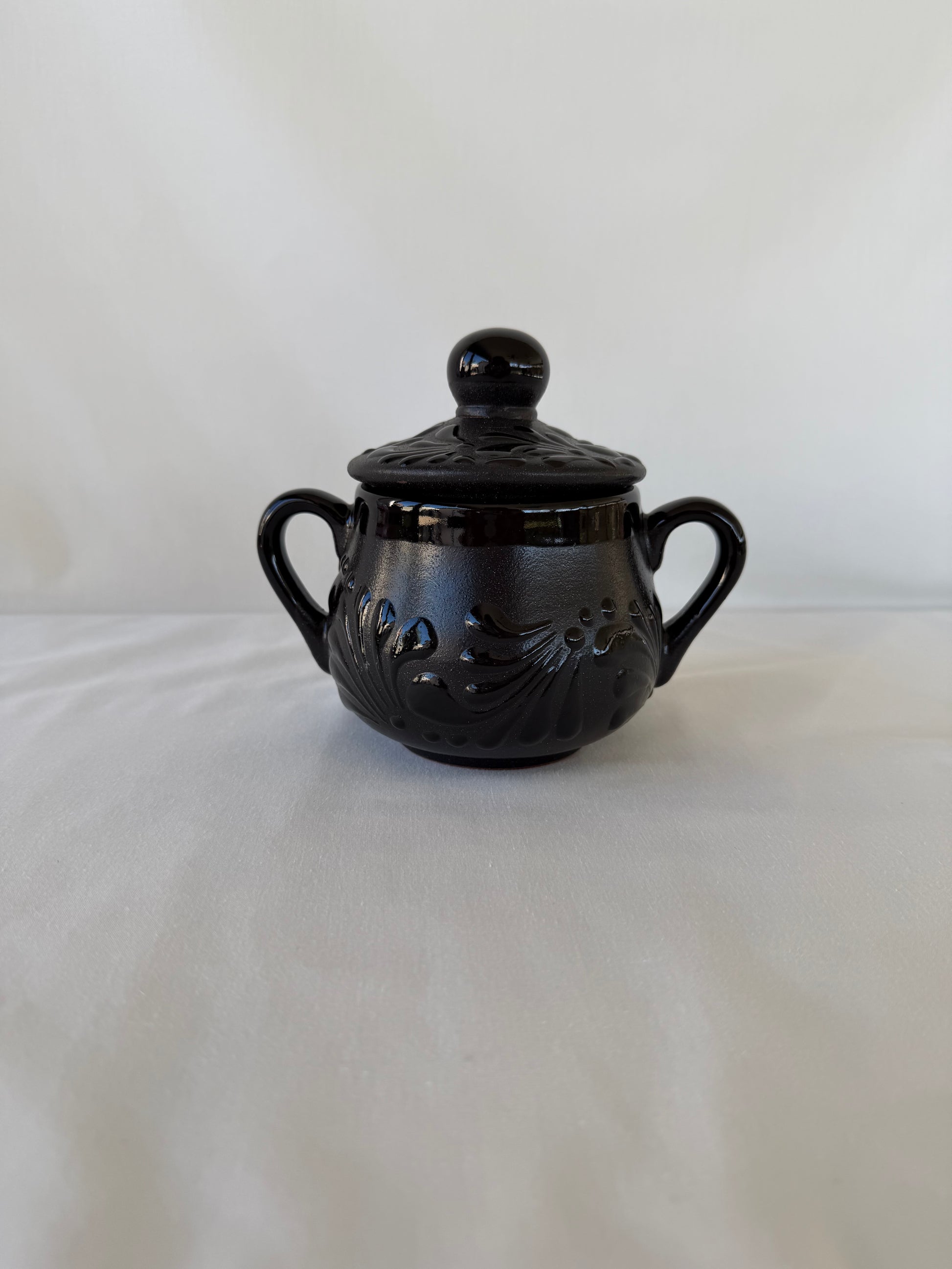Black sugar tray with black design. Swirl design. 6 3/4” tall. 6 1/2” wide. Holds ~20 fl. oz.