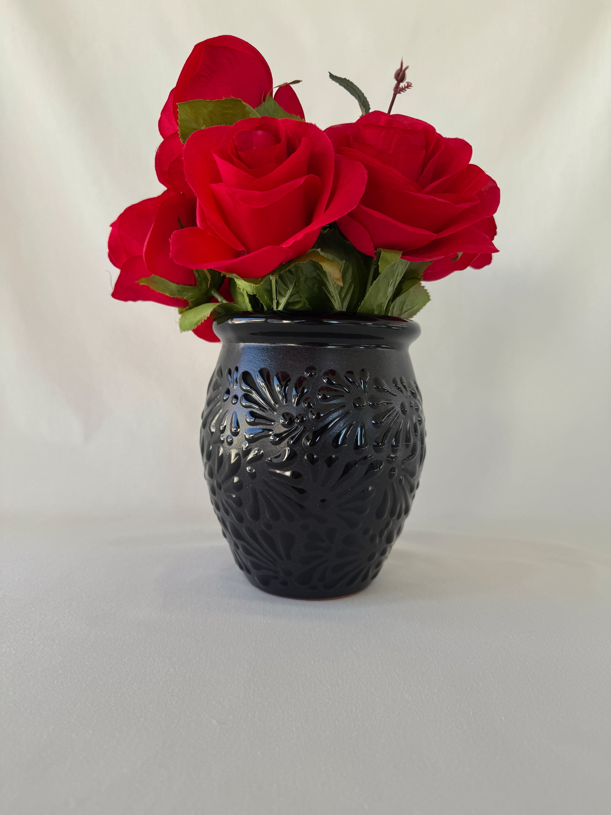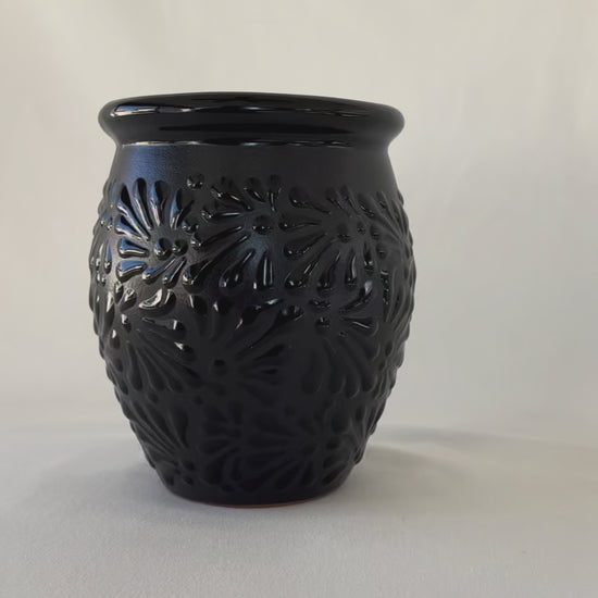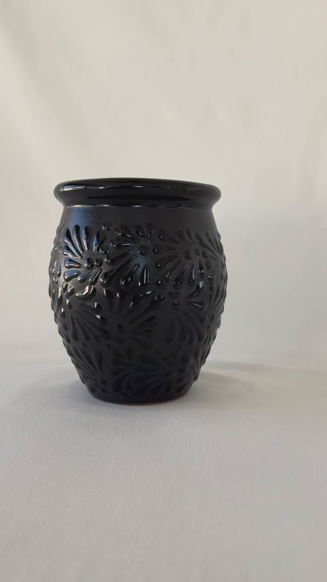 Black cantaro with black design. Burst design. 6 1/2” tall. Holds ~40 fl. oz.