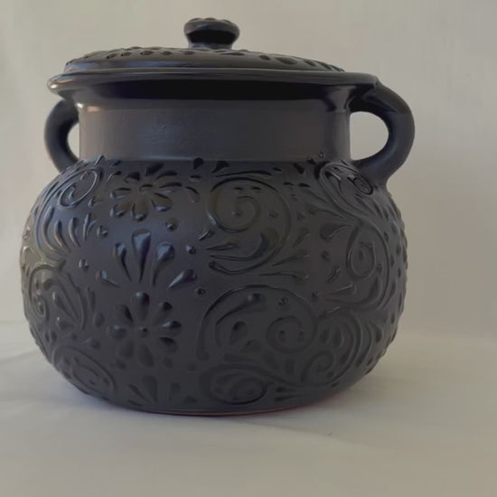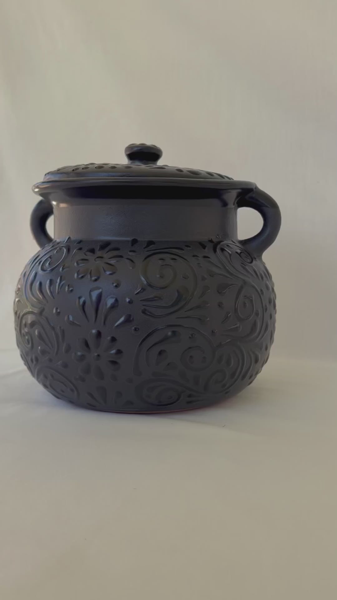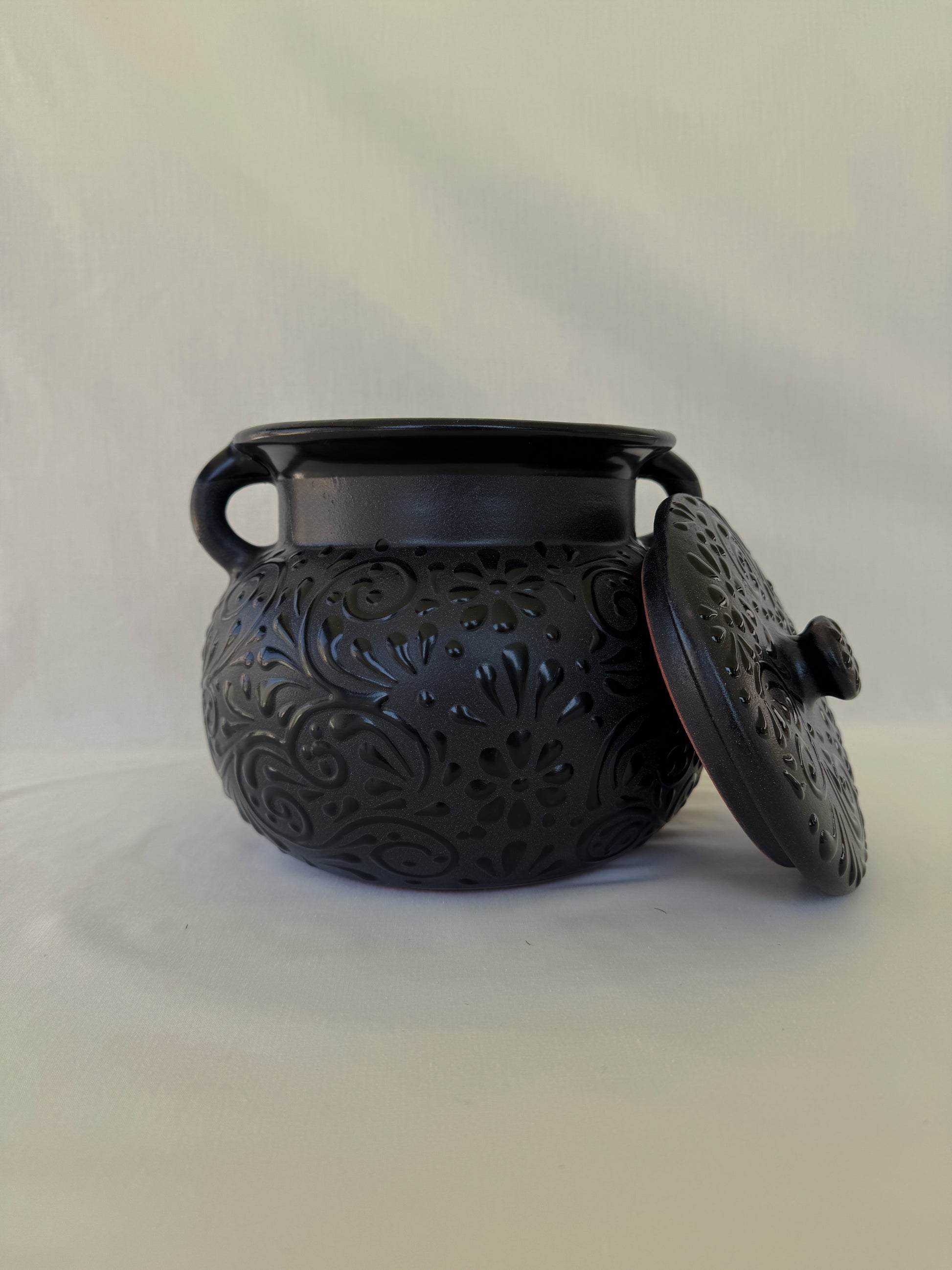 Black decorative medium frijolera with black design. Mix design. 8" tall