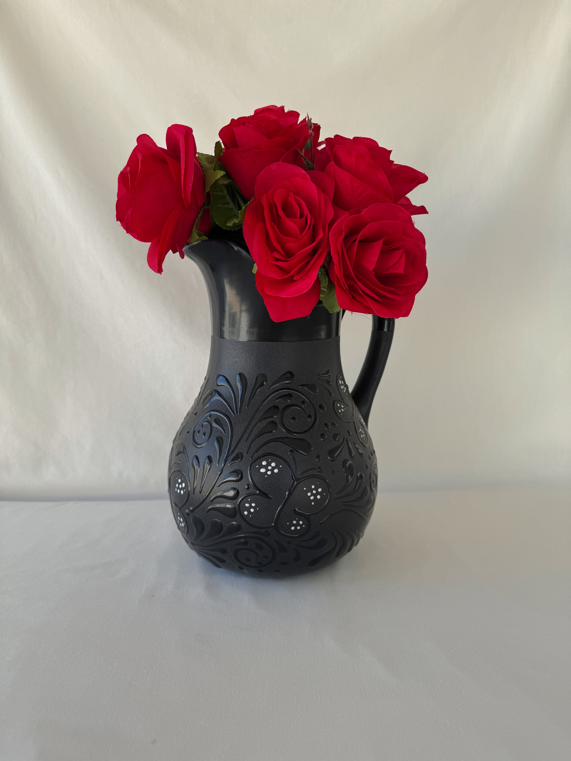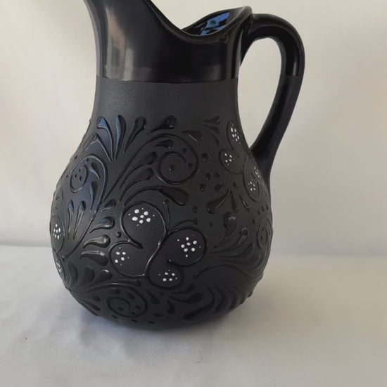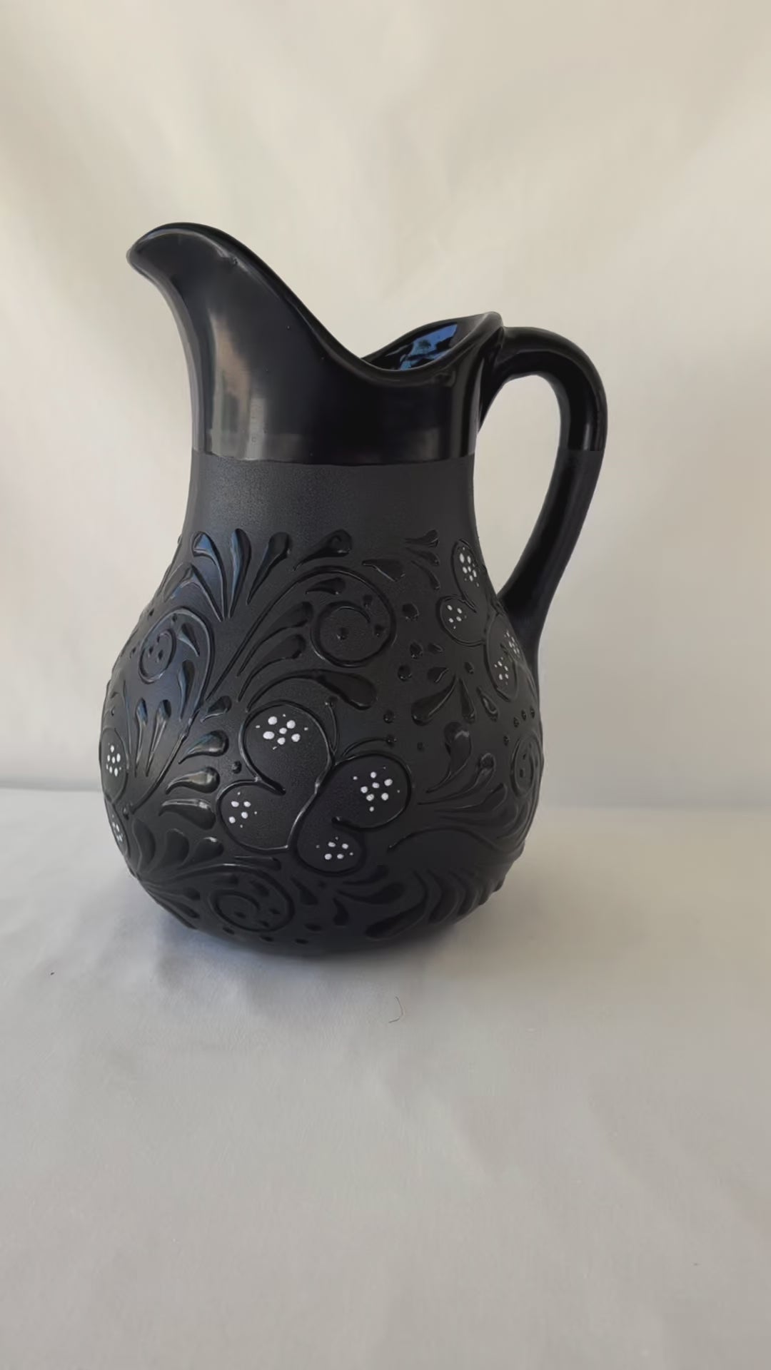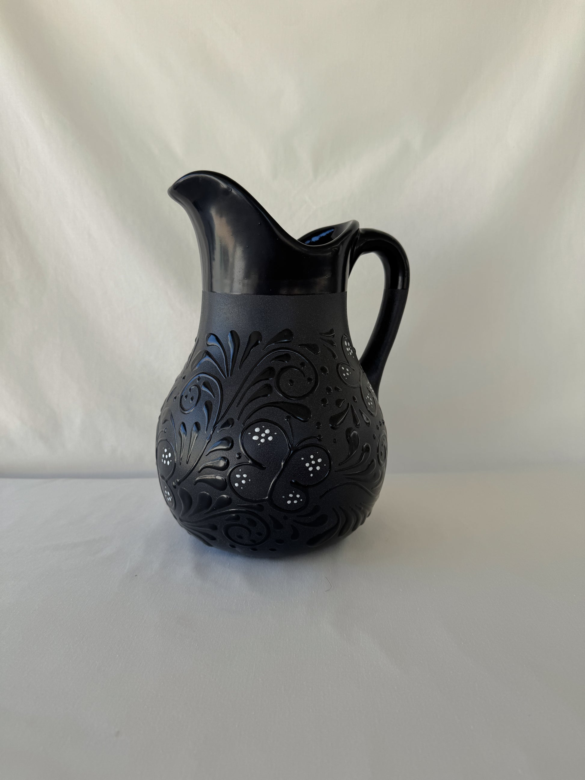Black pitcher with black design. Mix design. Black rim. Butterfly accent. 11 1/4" tall. Holds 110 fl. oz