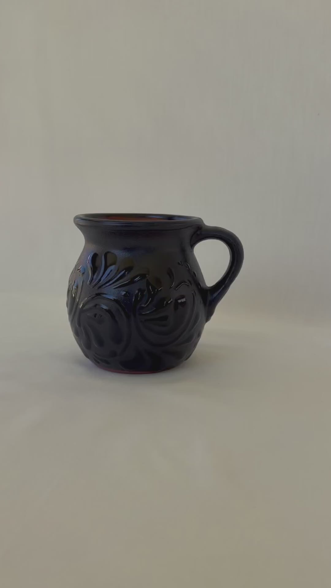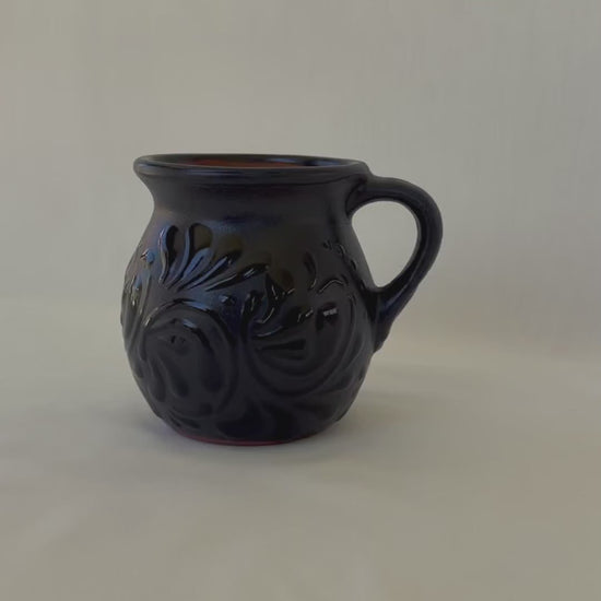 Black mug with black design. Swirl design. 4” tall. Holds 16 fl. oz.