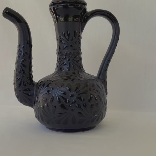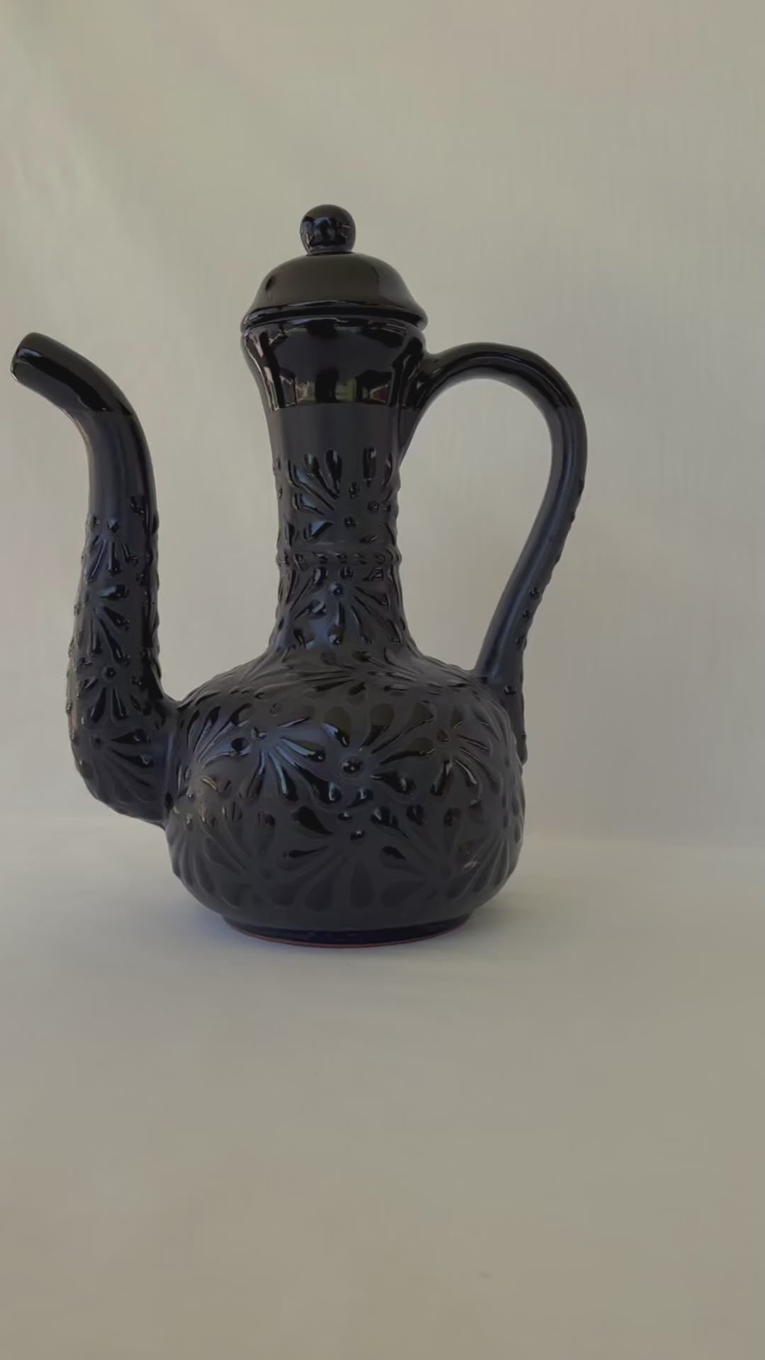 Black coffee/tea server with black design. Burst design. 11 1/2” tall. Holds 48 fl. oz.