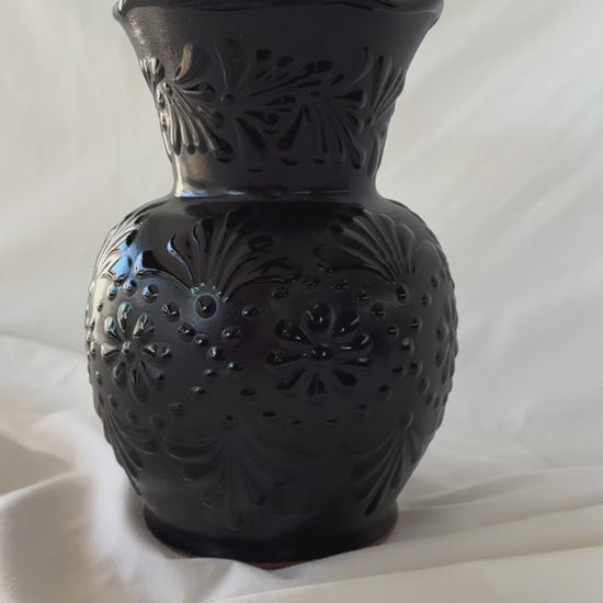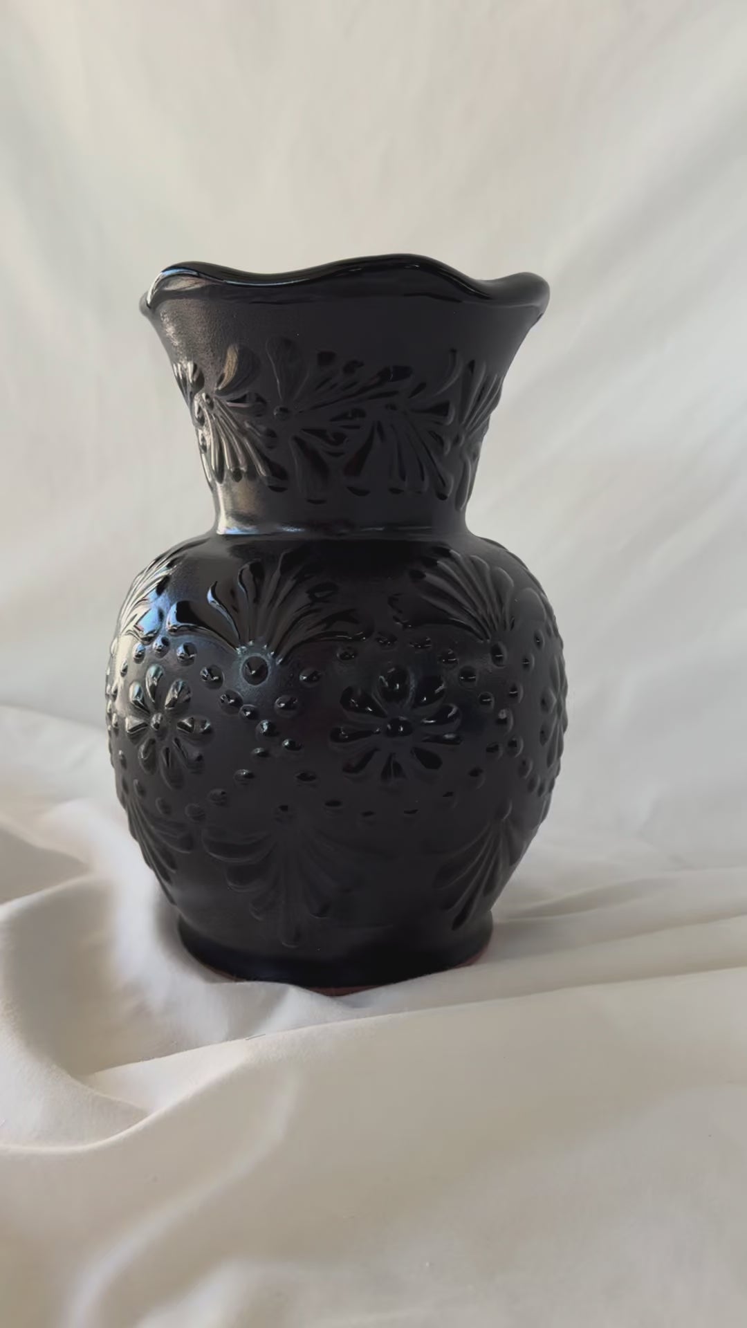 Black wavy vase with black design. Mix design. Wavy accent rim. 9” tall
