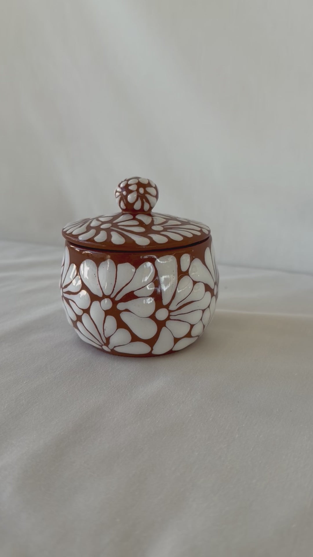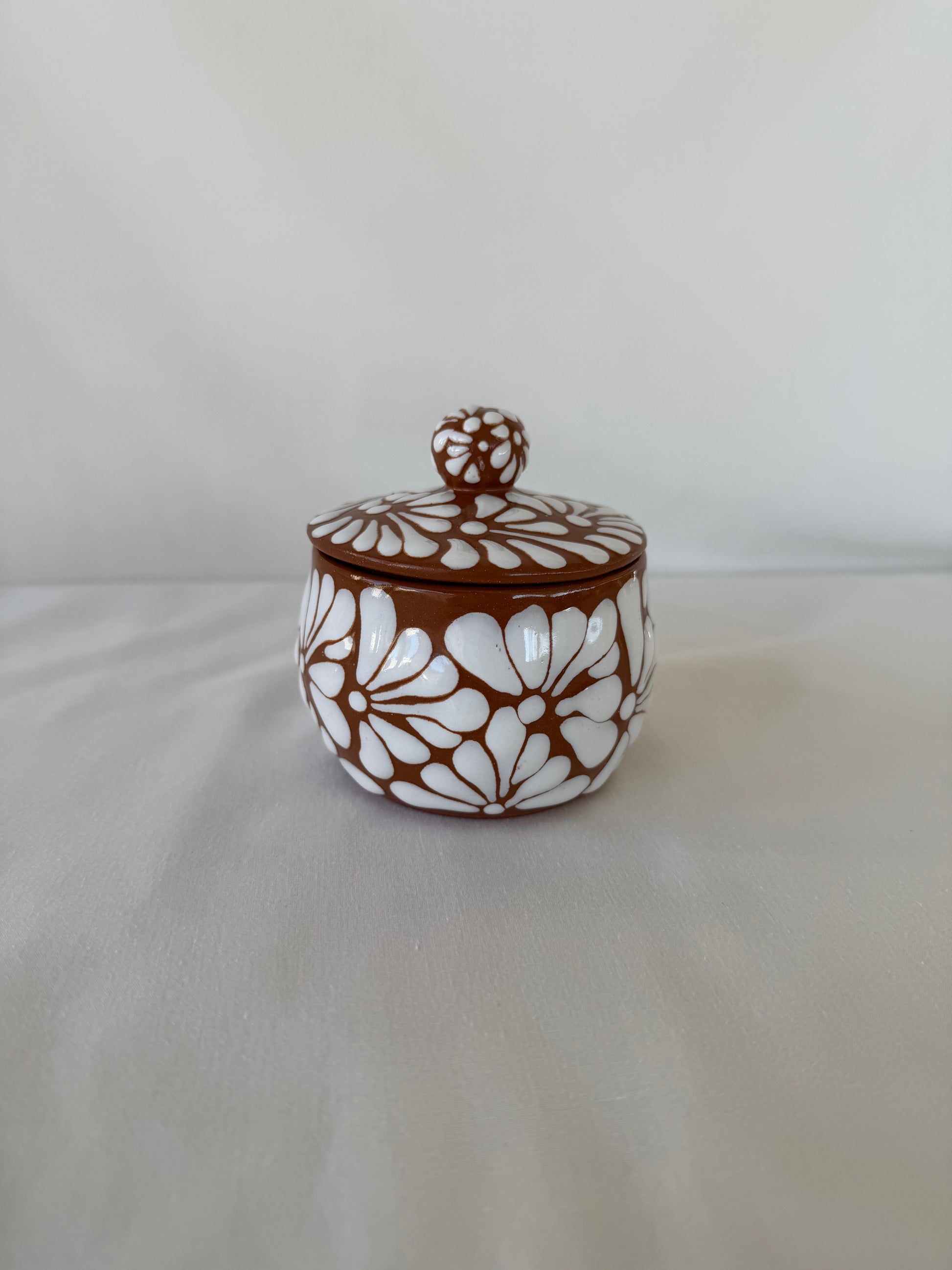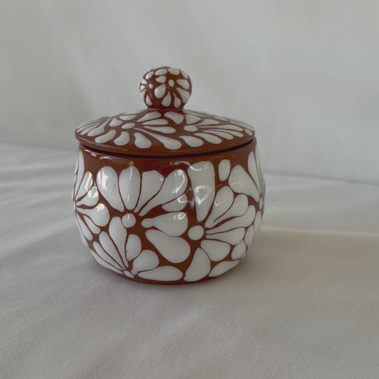 Brown jewelry container and lid with white design. Burst design. 4” tall. 3 1/2” diameter.