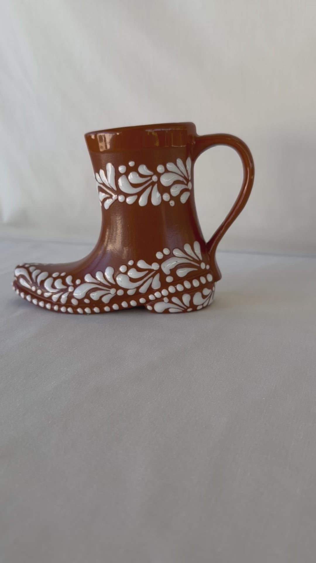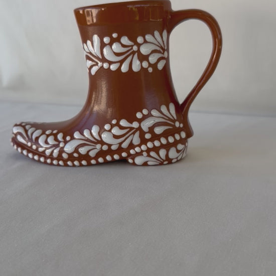Brown boot mug with white design. Swirl design. Glossy brown rim. 5” tall. 7” wide. Holds ~14 fl. oz.