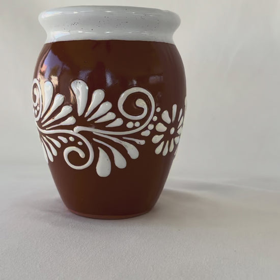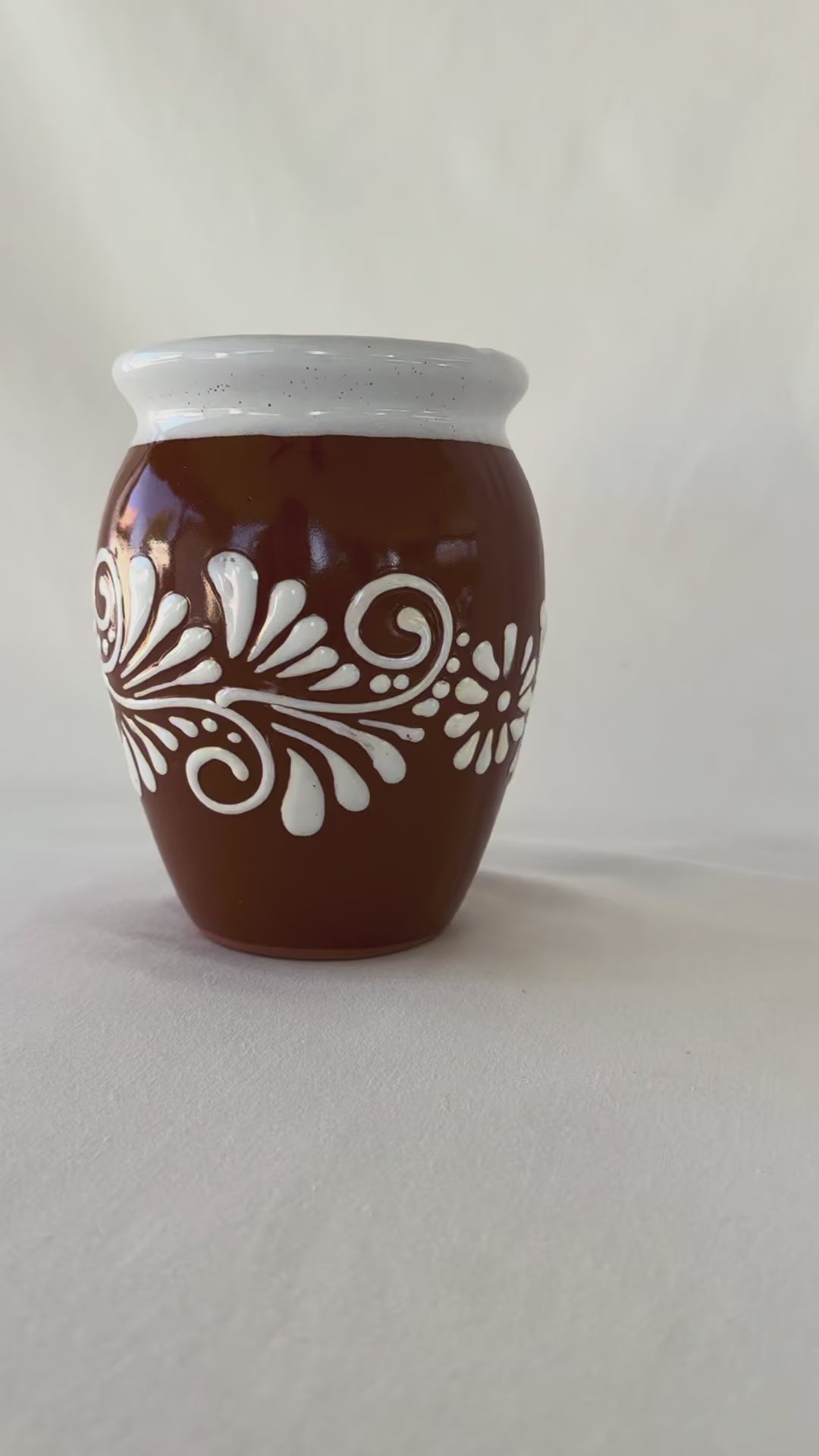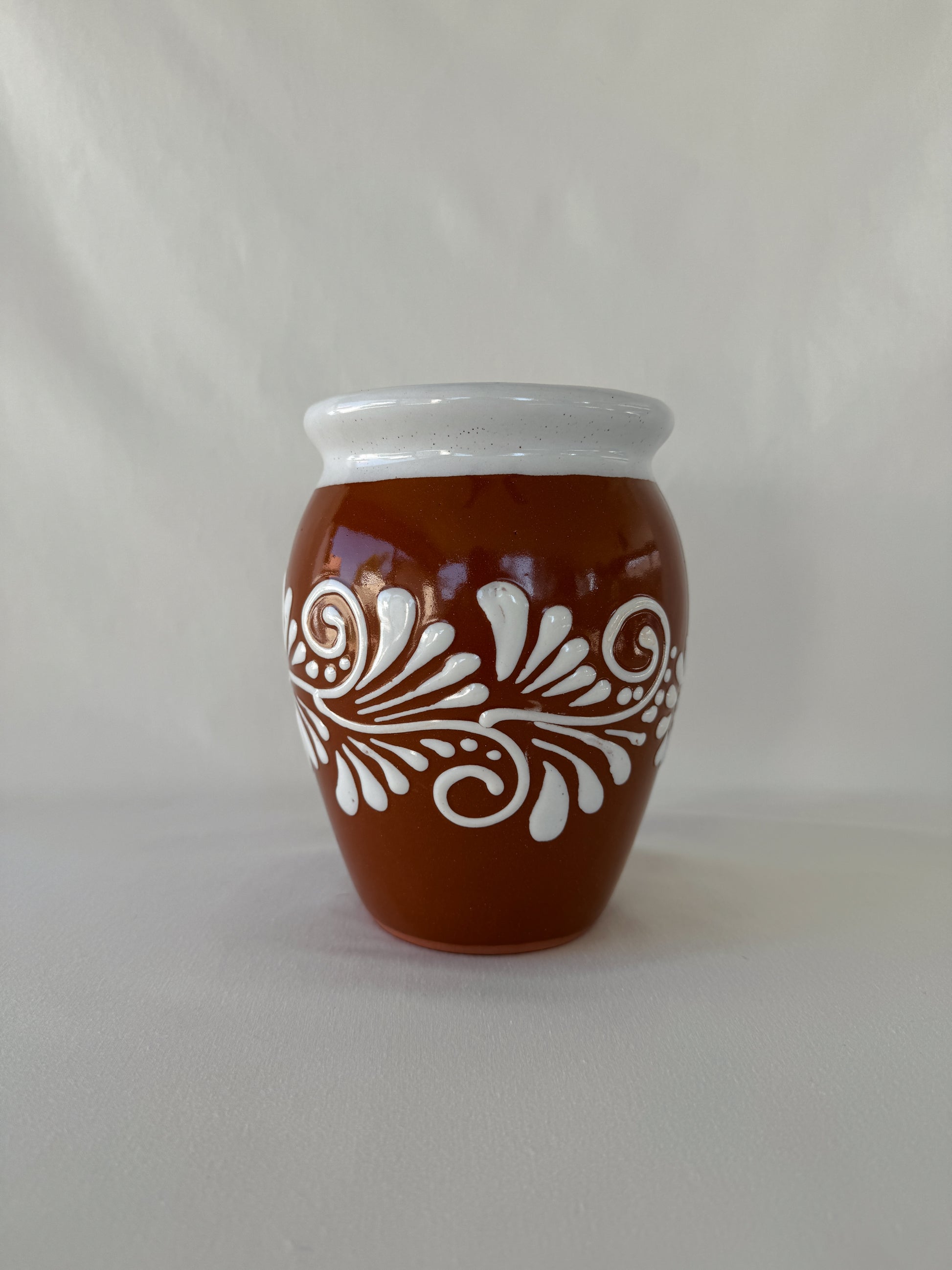 Brown cantaro with white design. Swirl design. Glossy white rim. 6 1/2” tall. Holds ~40 fl. oz.