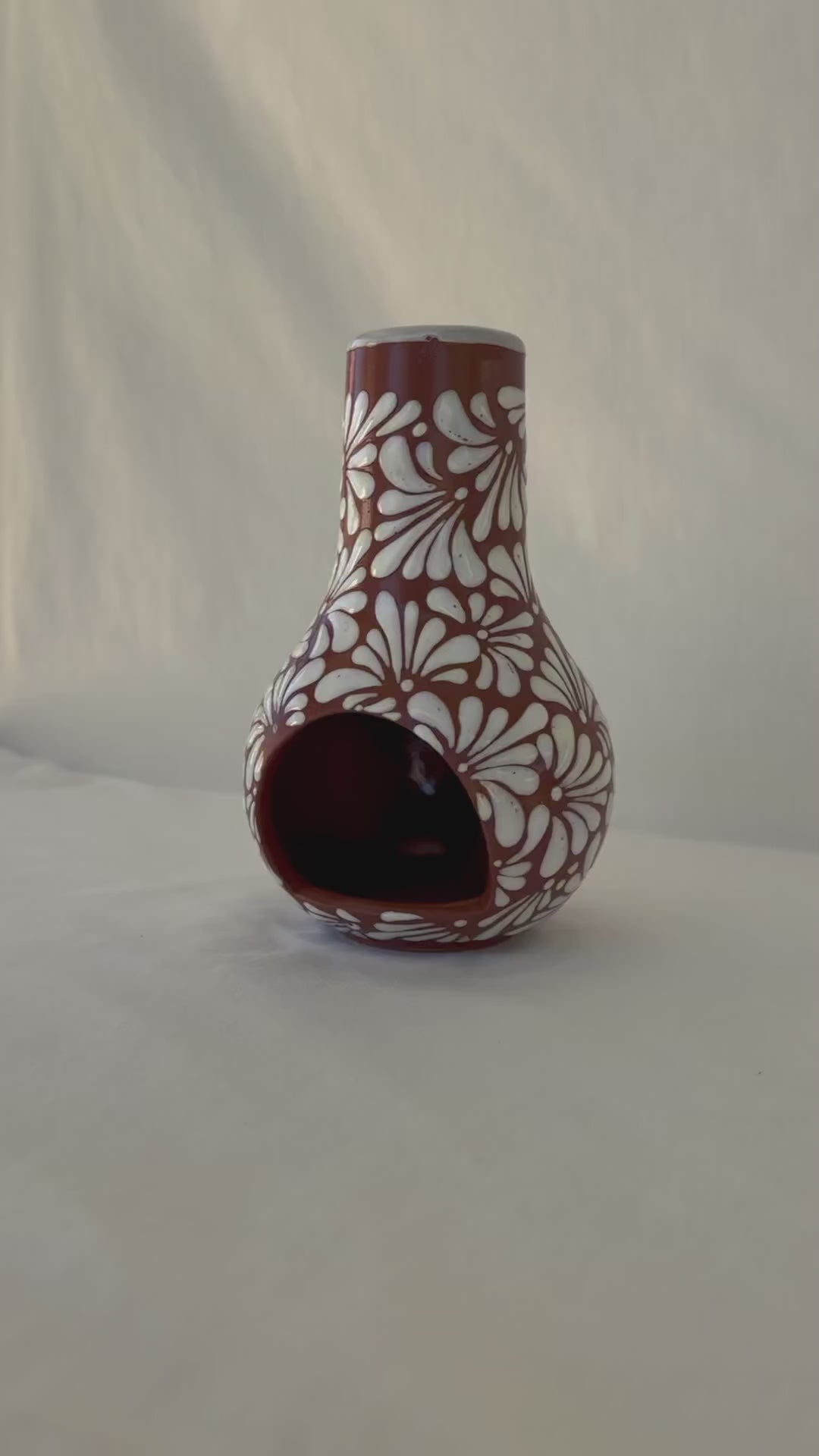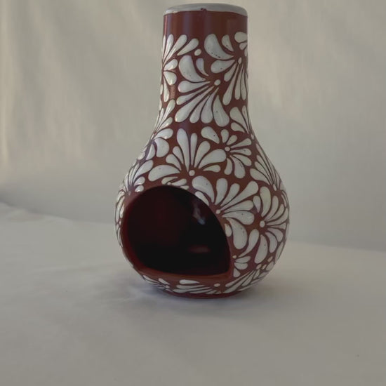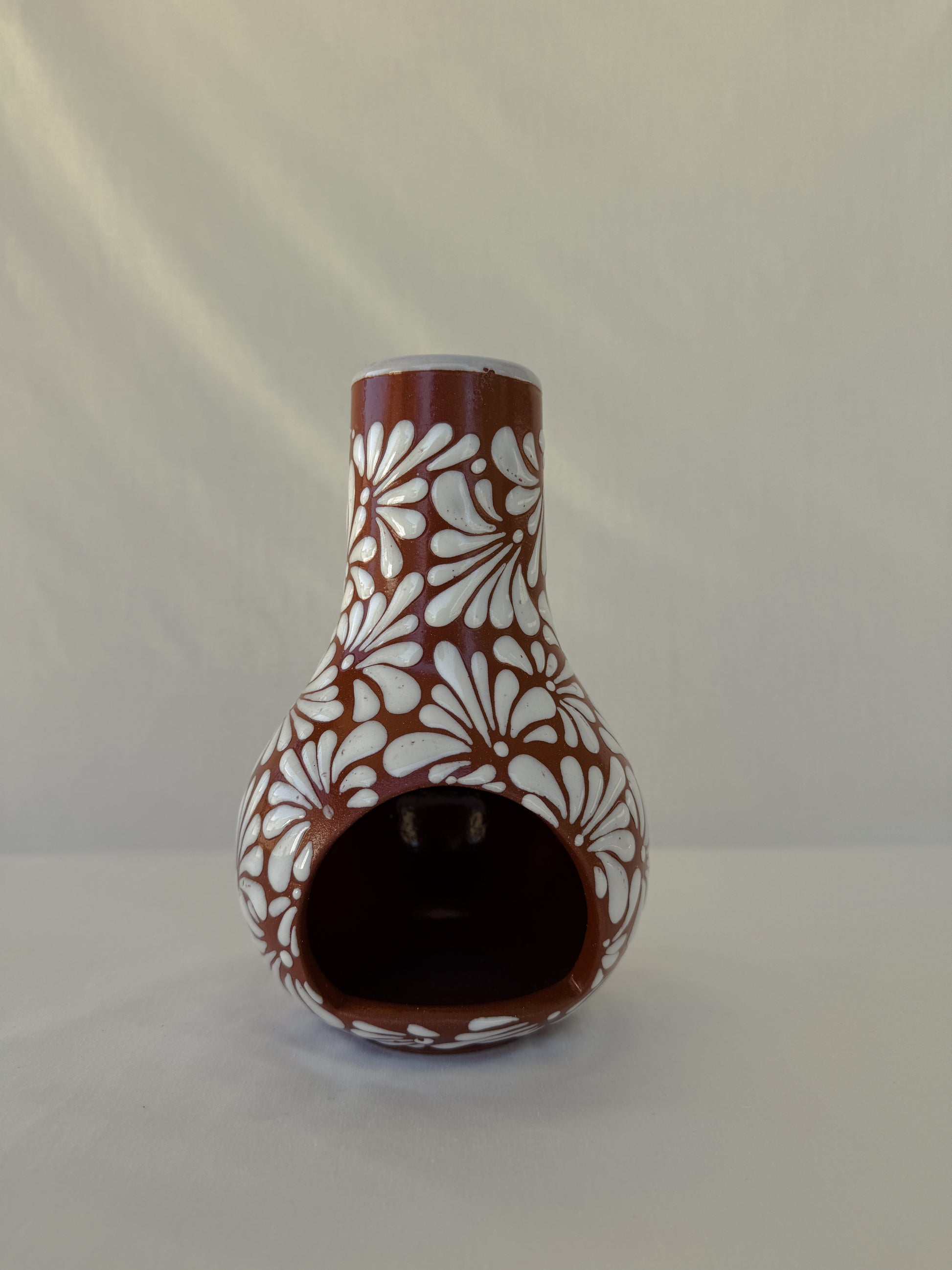 Brown chimenea with full white design. Burst design. 7 1/2" tall