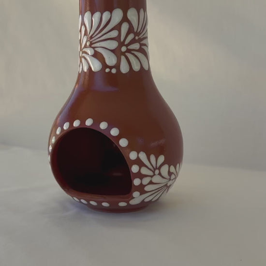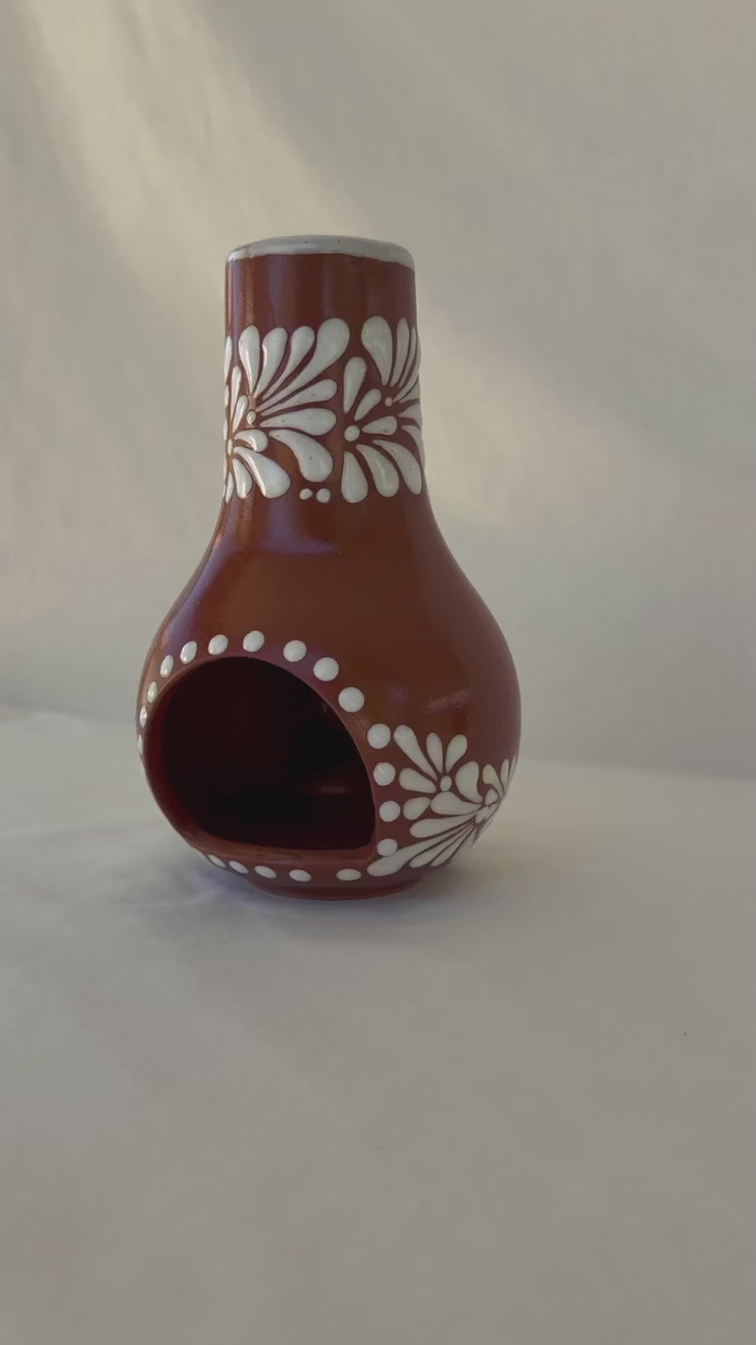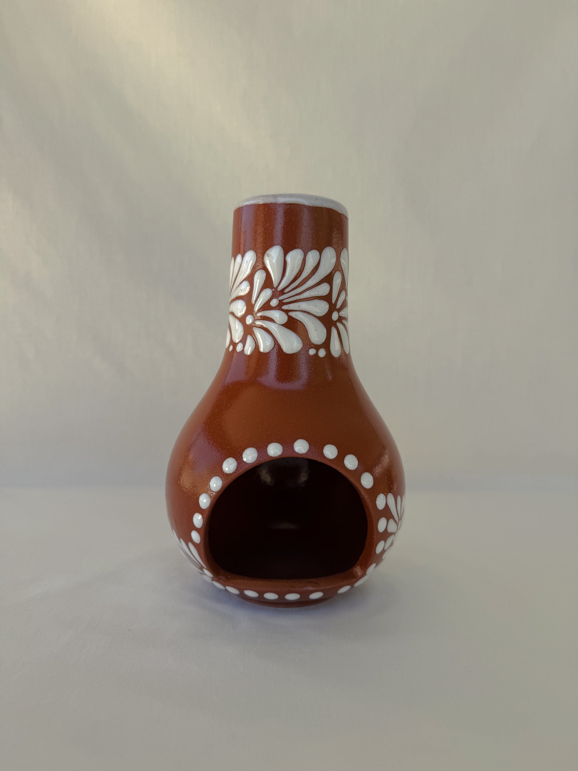 Brown chimenea with partial white design. Burst design with dotted accent. 7 1/2" tall