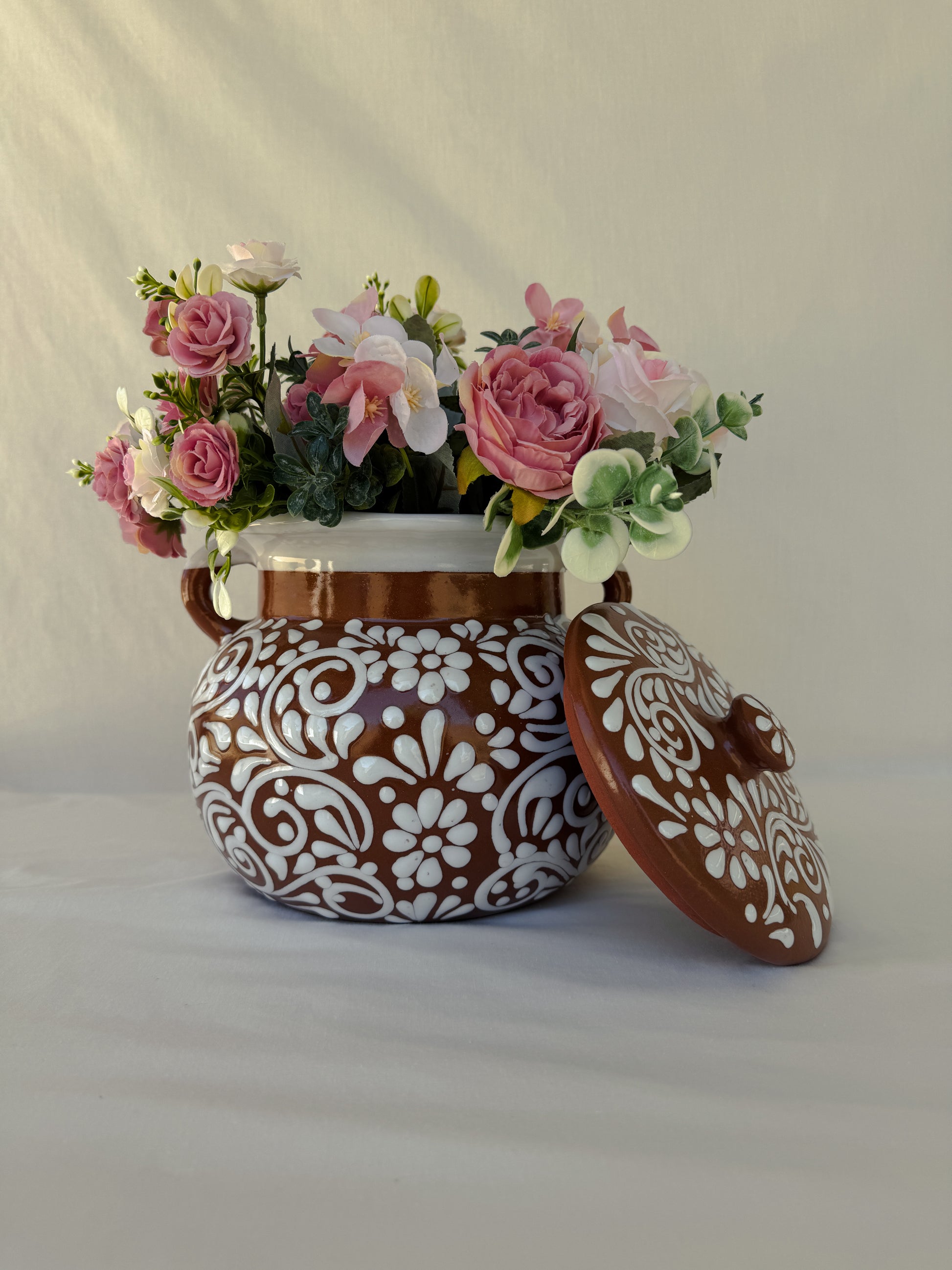 Brown decorative medium frijolera with white design. Mix design. 8" tall