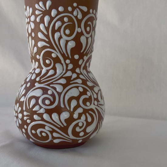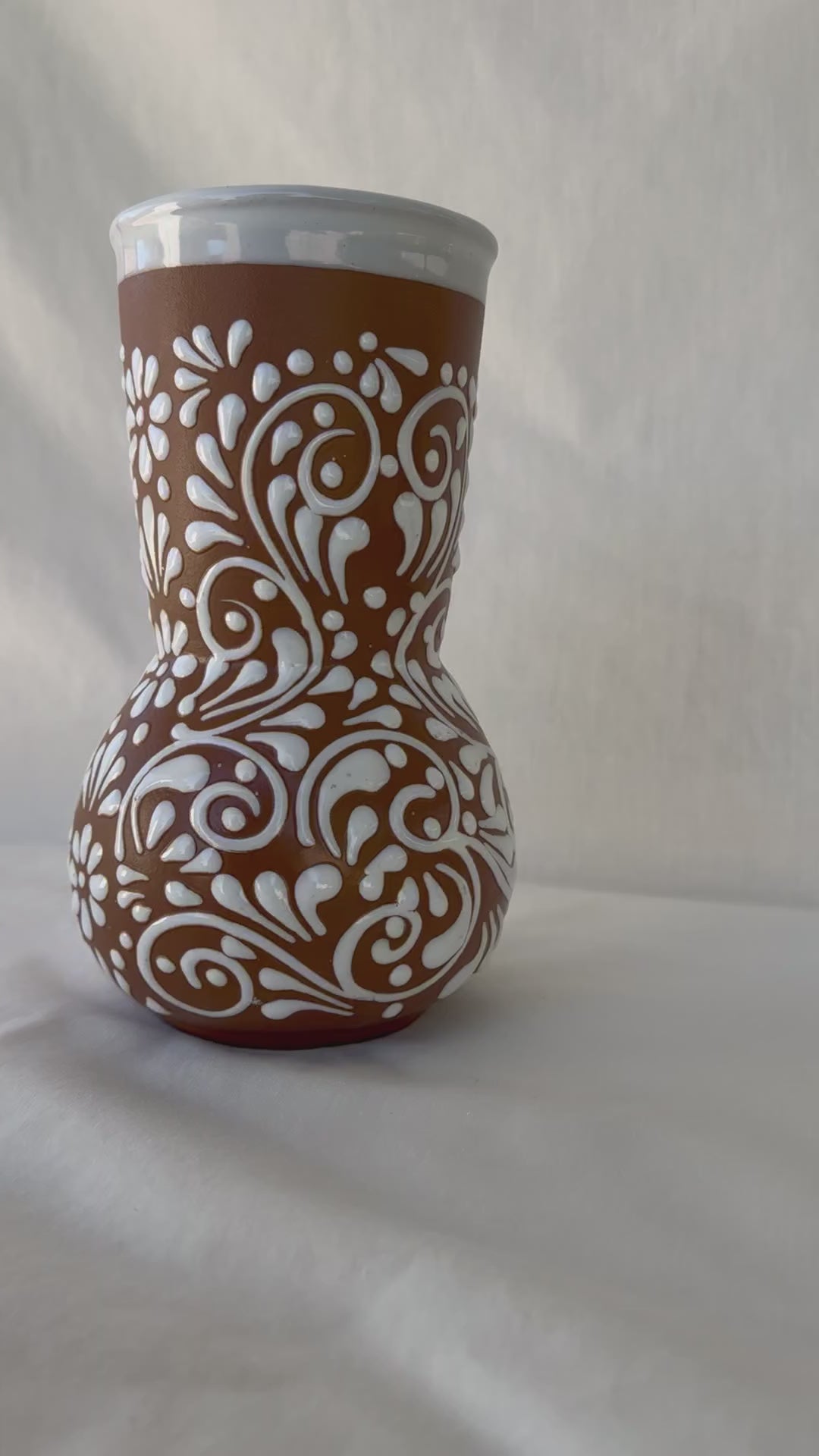Brown medium vase with white design. Glossy white rim. Mix design. 9” tall