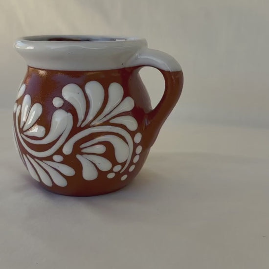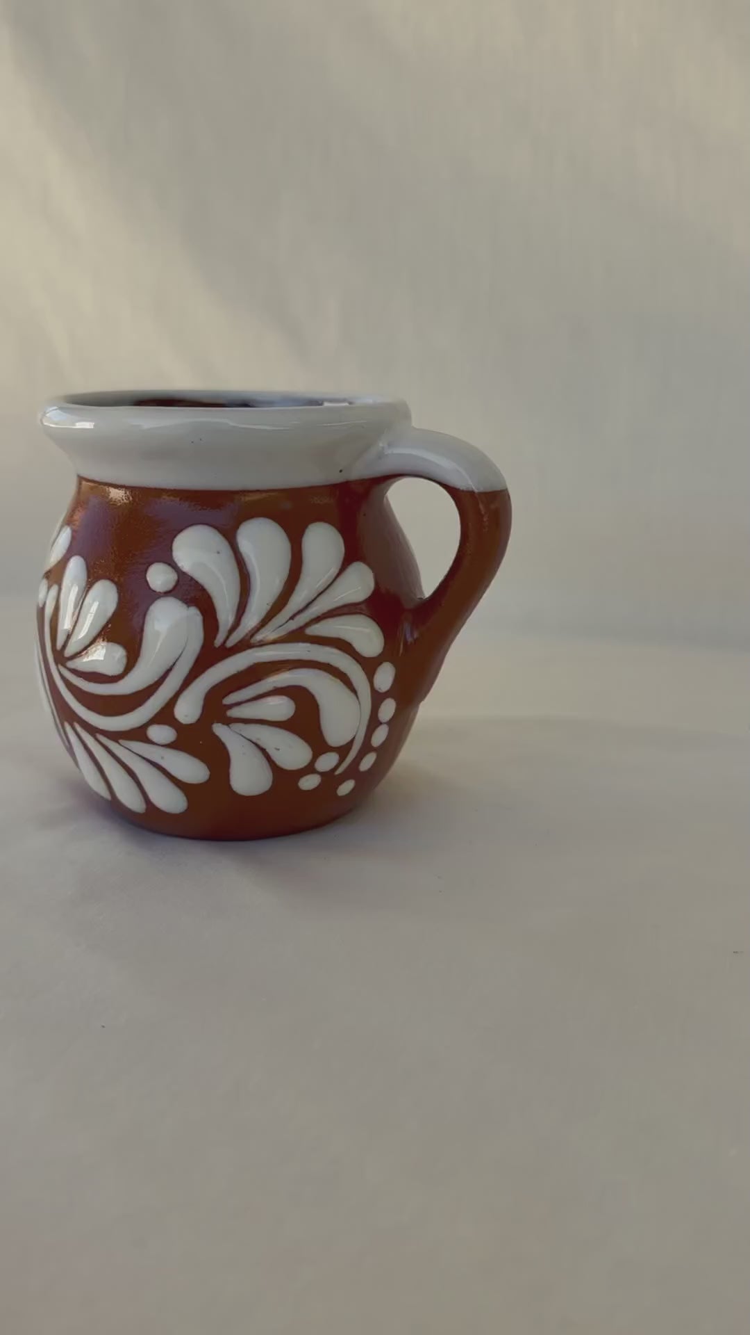 Brown mug with white design. Swirl design. White rim. 4" tall. Holds 16 fl. oz.
