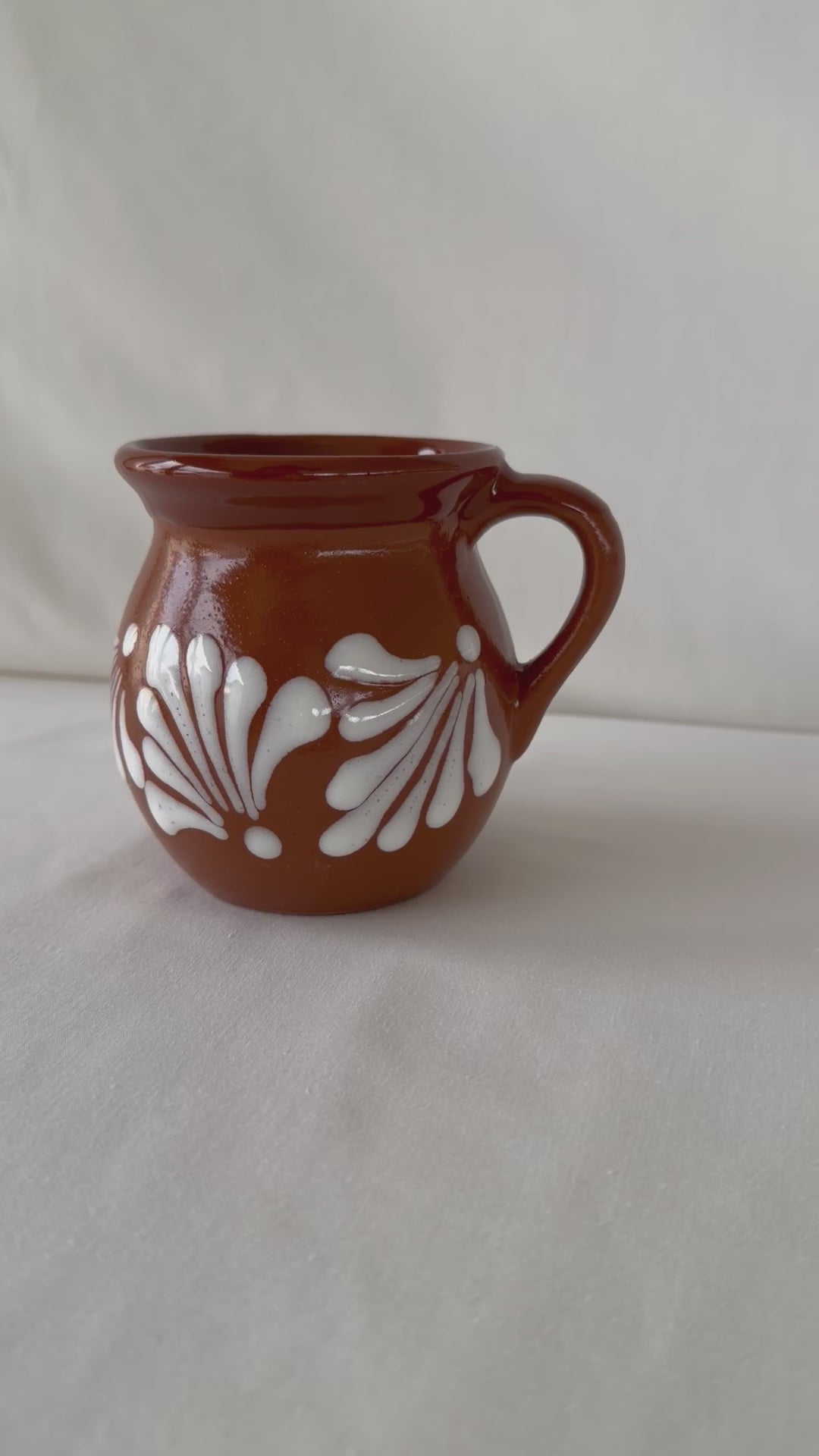 Brown mug with white design. Fan design. Glossy brown rim. 4” tall. Holds ~16 fl. oz.