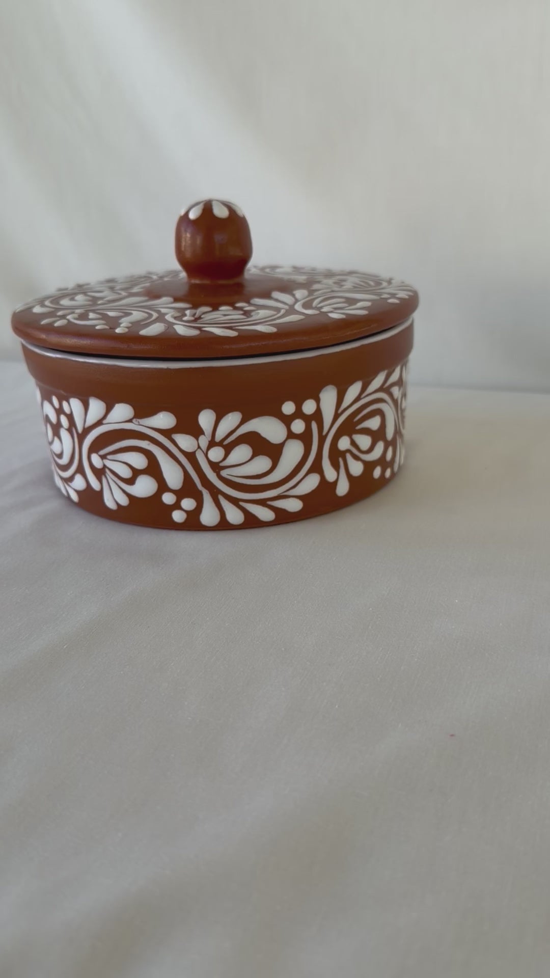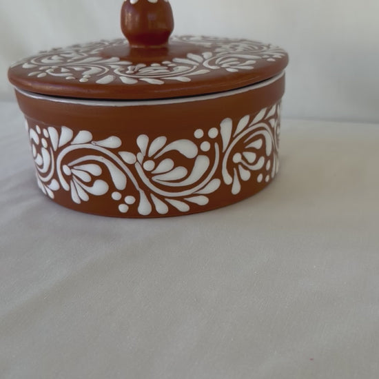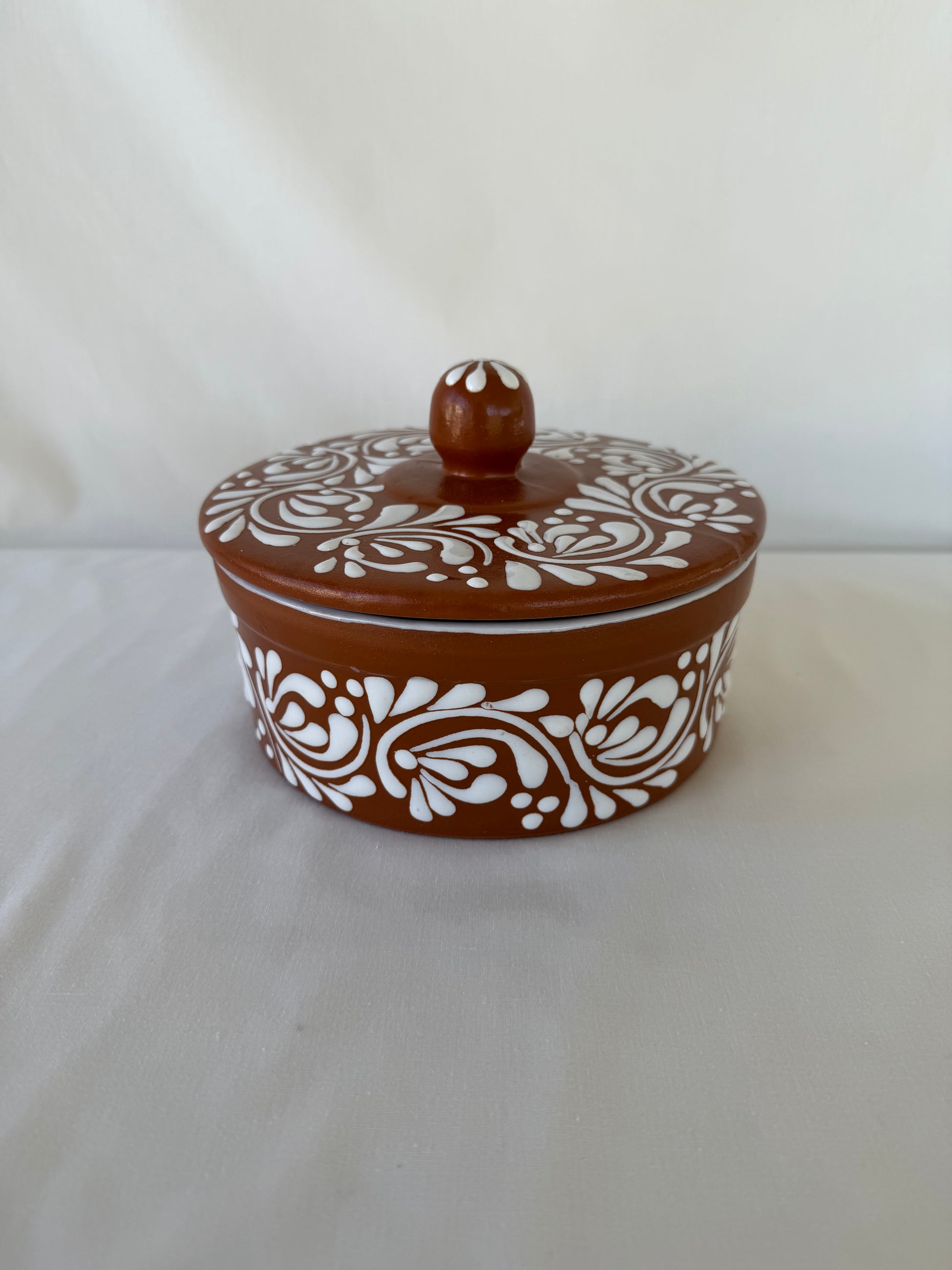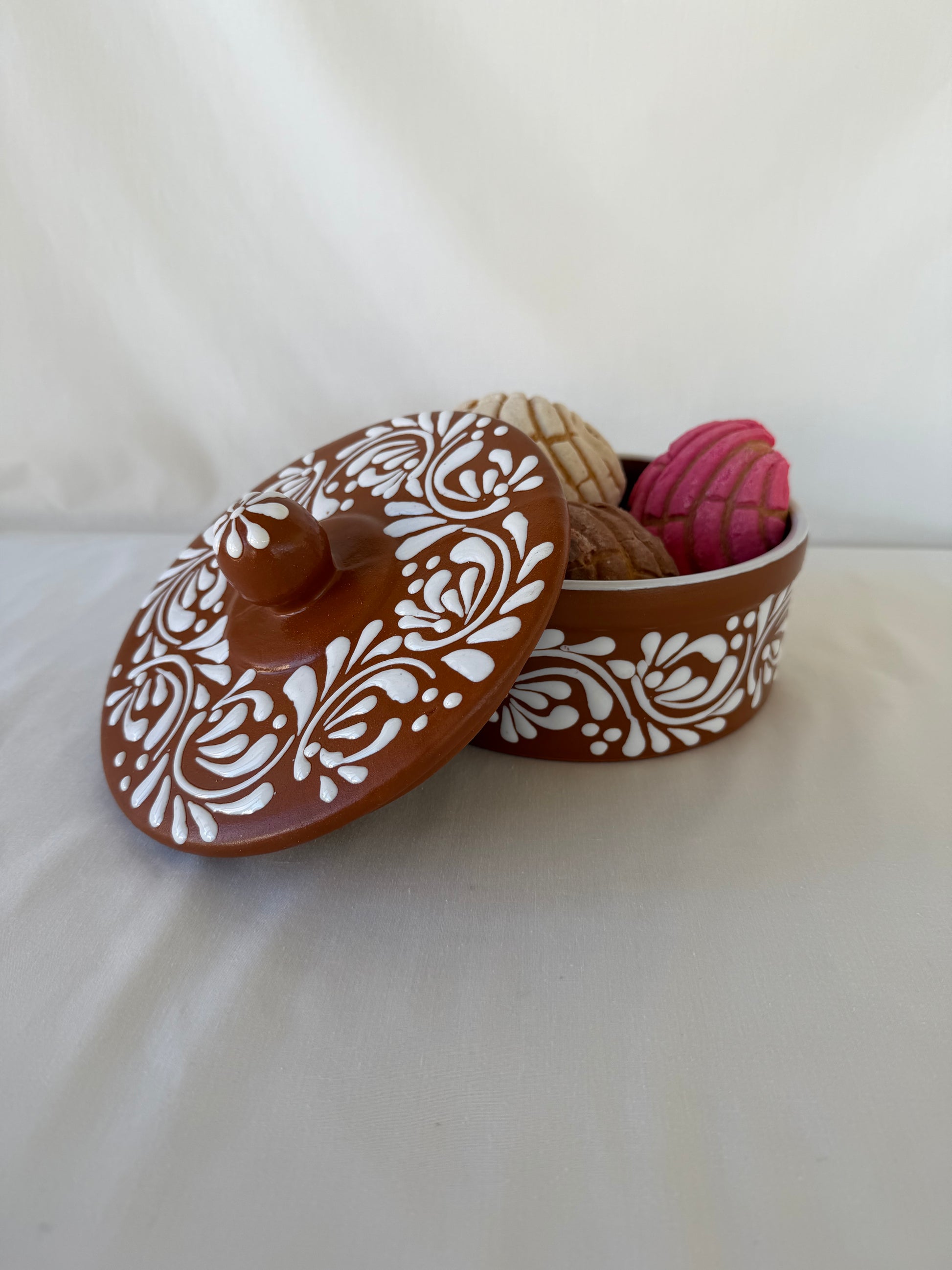 Brown tortilla holder with white design. Mix design. 8” diameter. 4” tall.