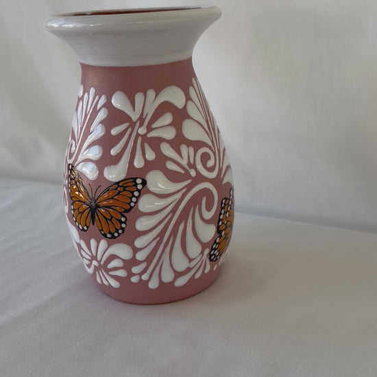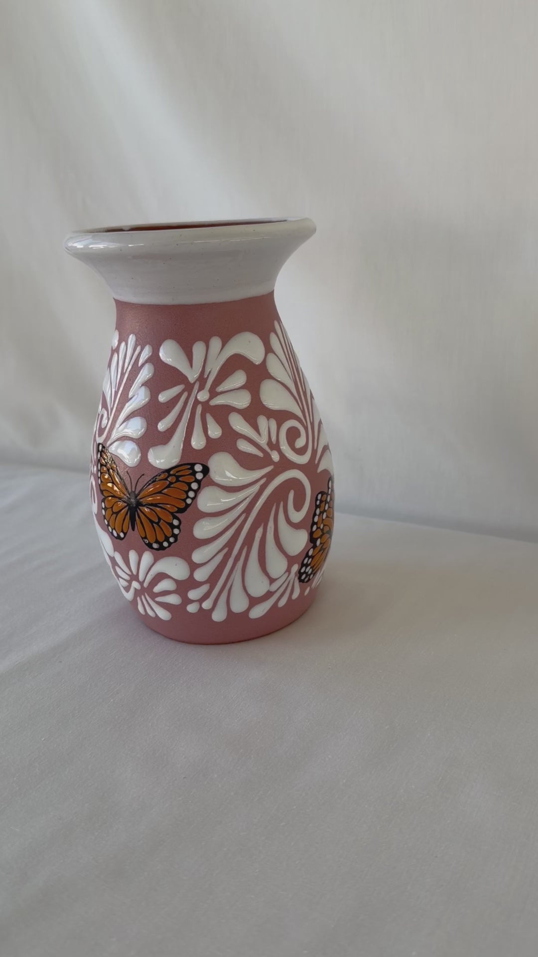 Pink boliche vase with white design. Swirl design. Monarch butterfly accent. Glossy white rim. 7 1/2” tall