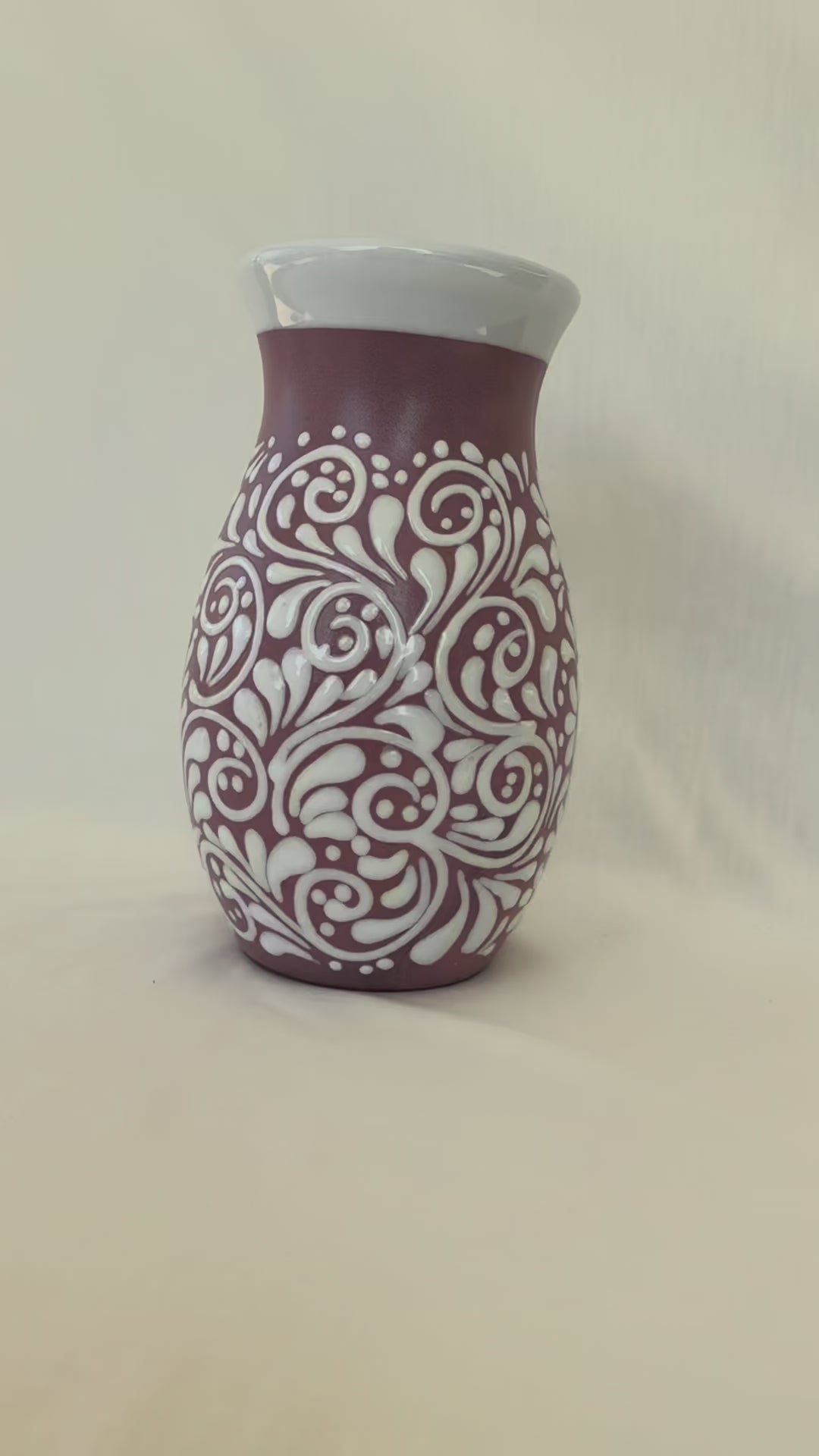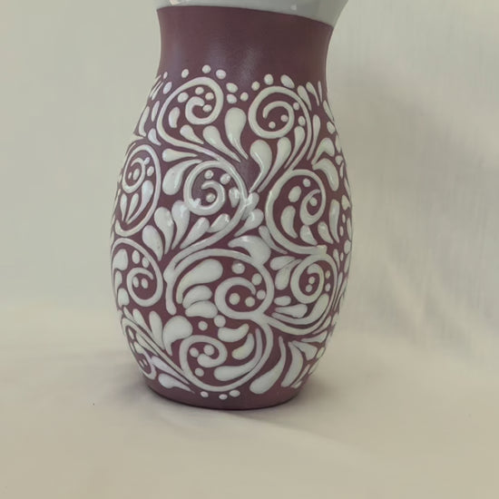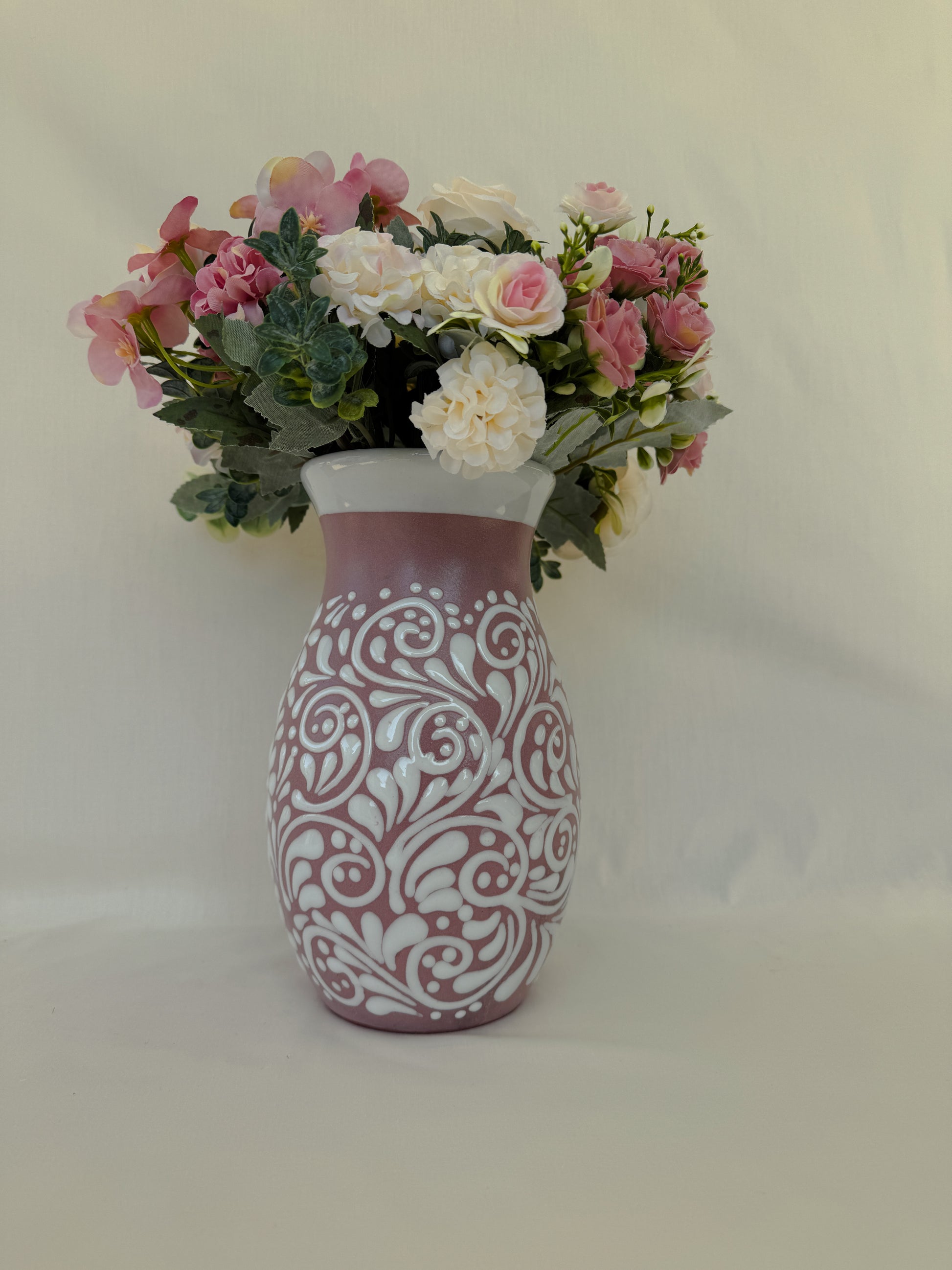 Pink boliche vase with white design. Mix design. Glossy white rim. 9 1/2” tall