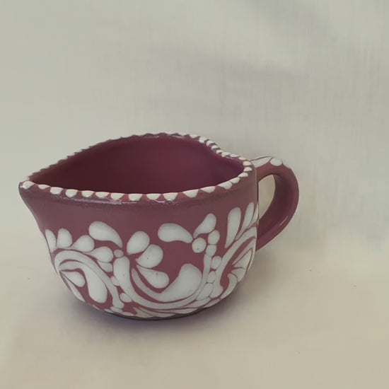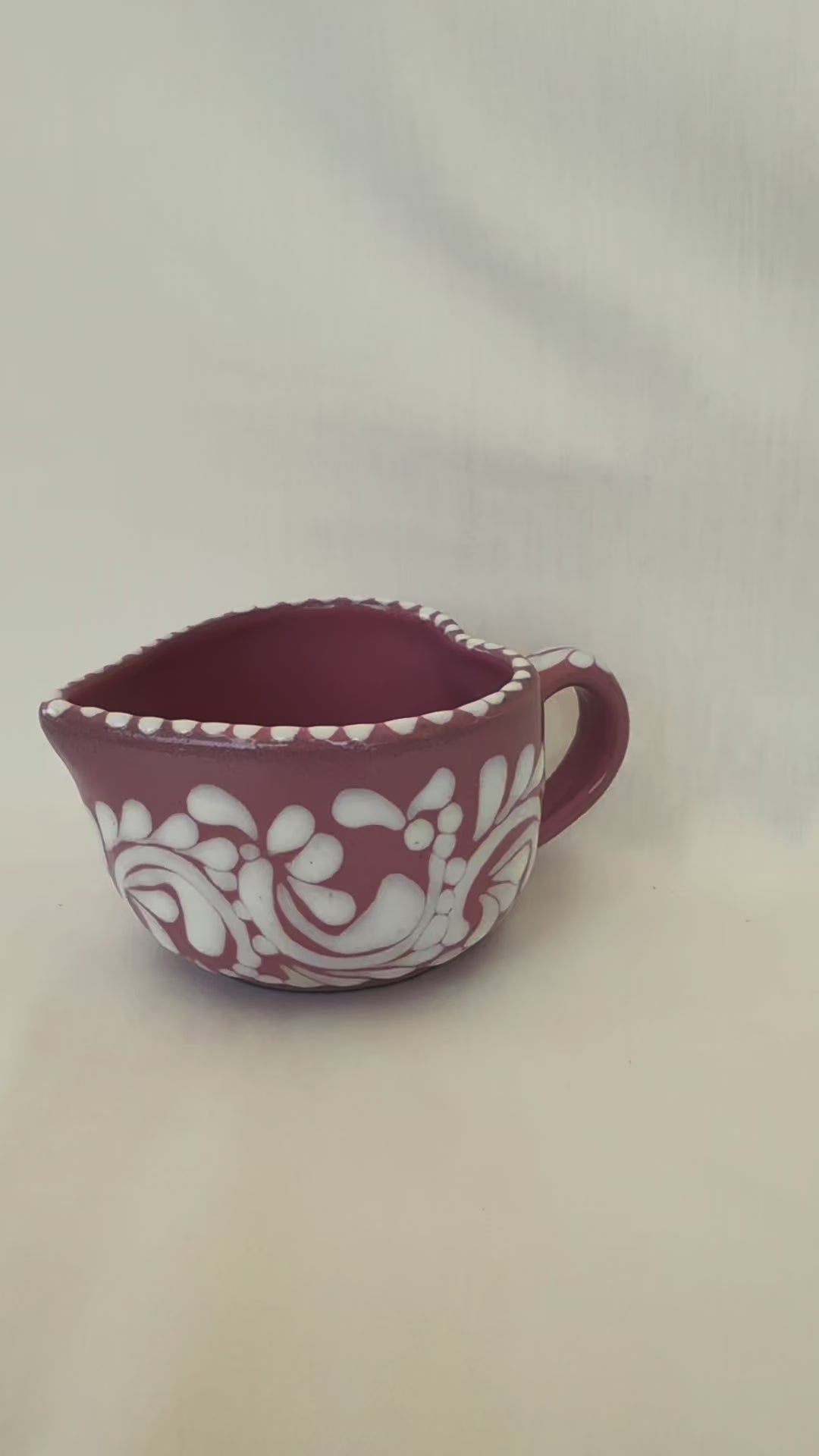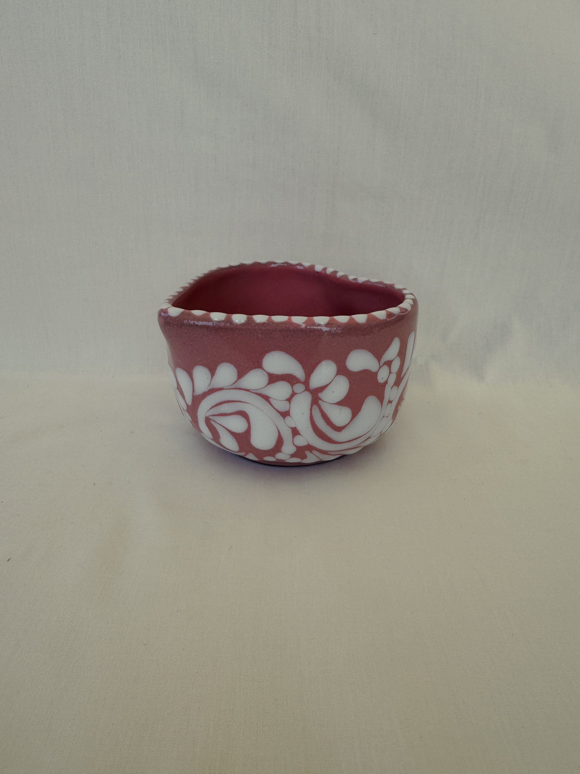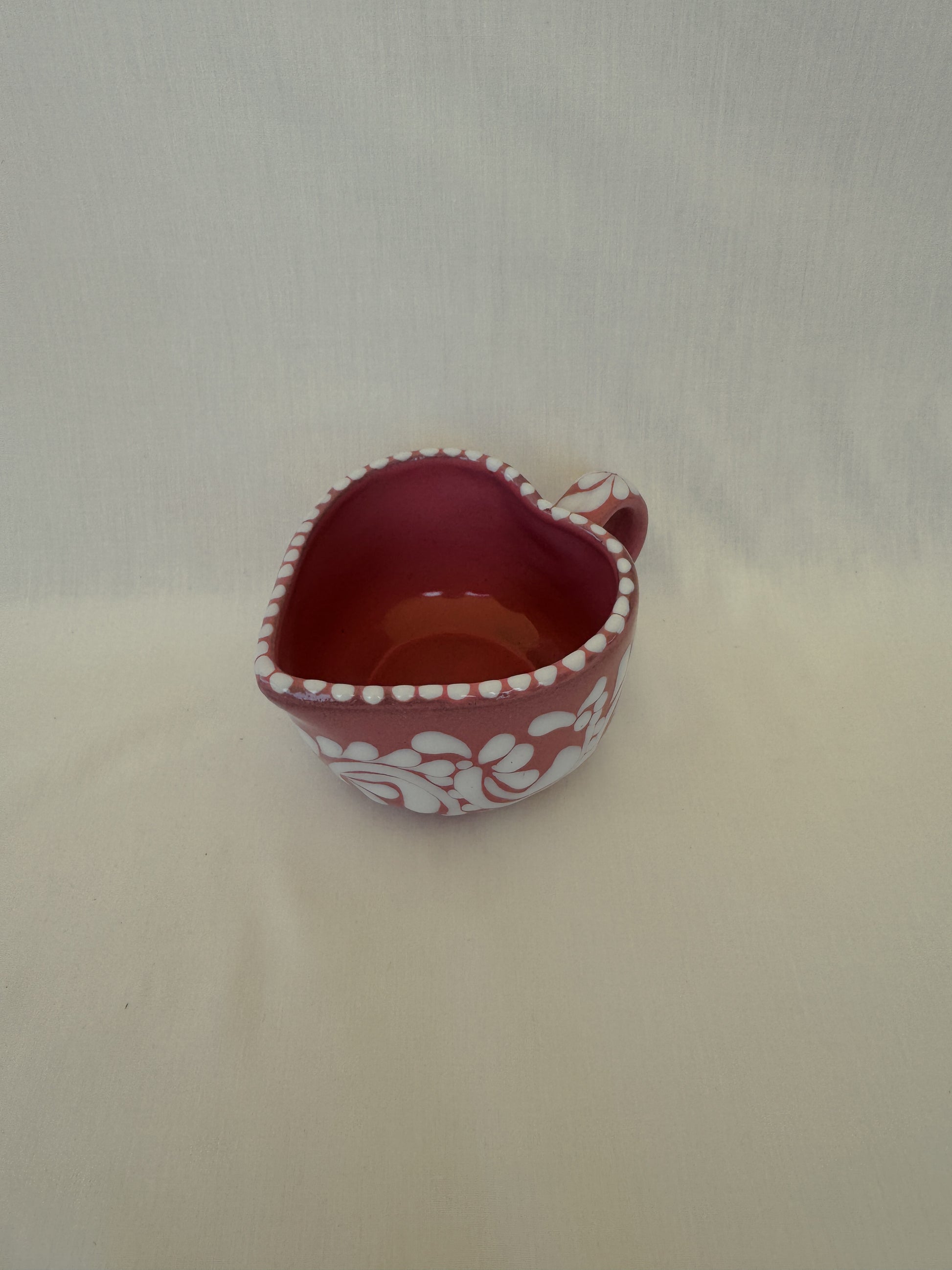 Pink heart mug with white design. White dotted accent. Mix design. 3” tall. 6 1/2” wide. Holds 20 fl. oz.