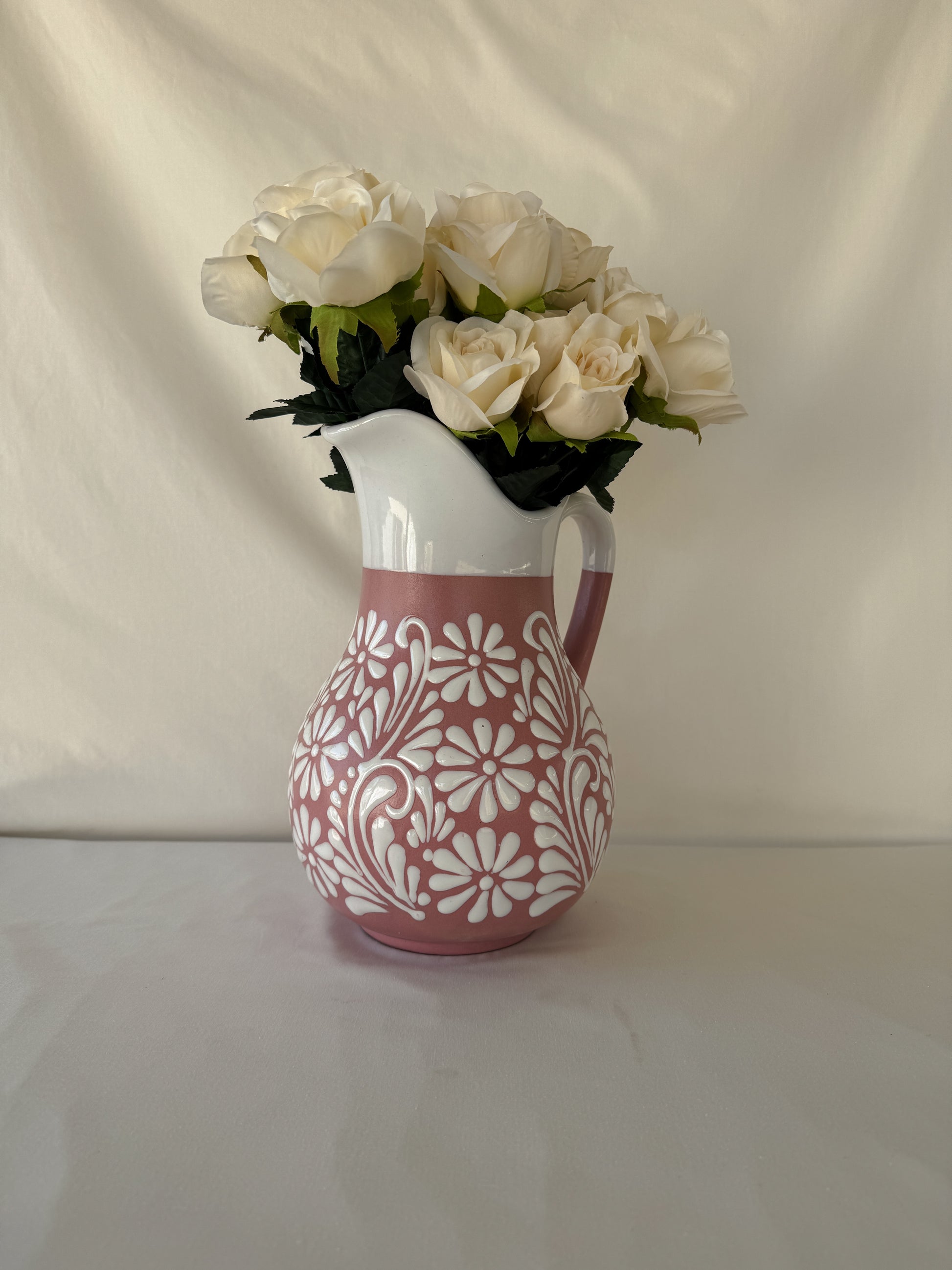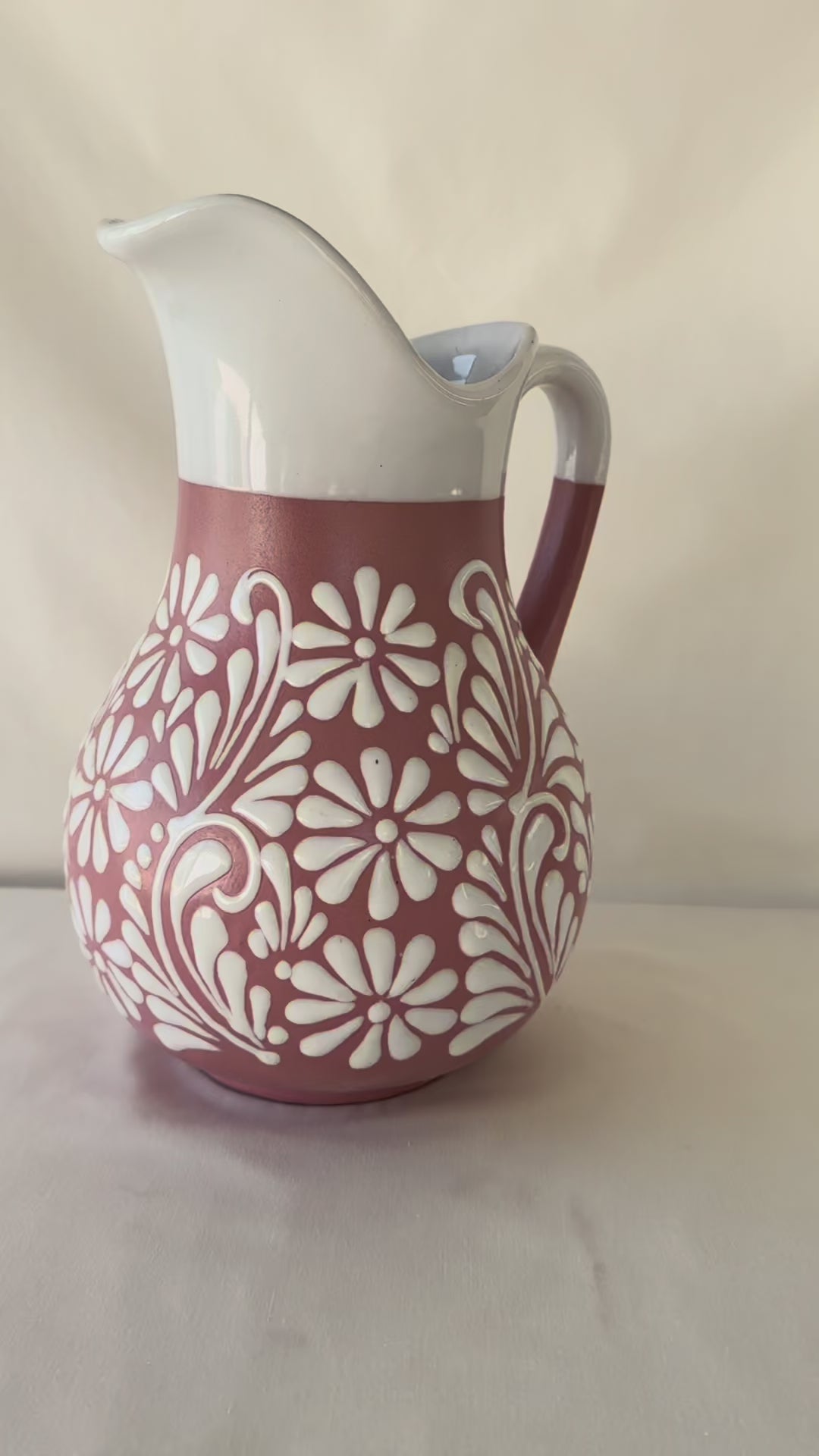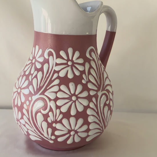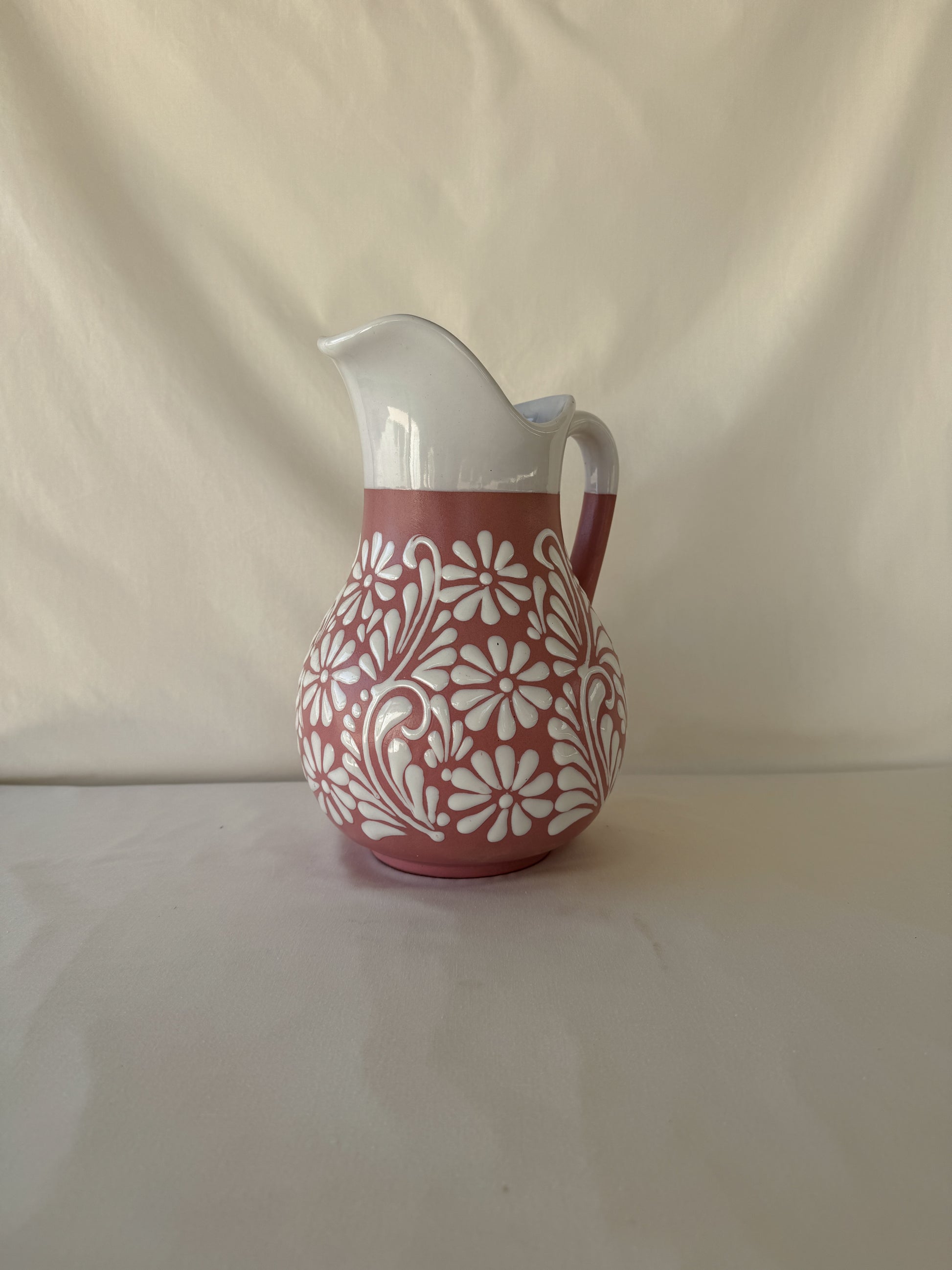 Pink pitcher with white design. Mix design. White rim. 11 1/4” tall. Holds 110 fl. oz