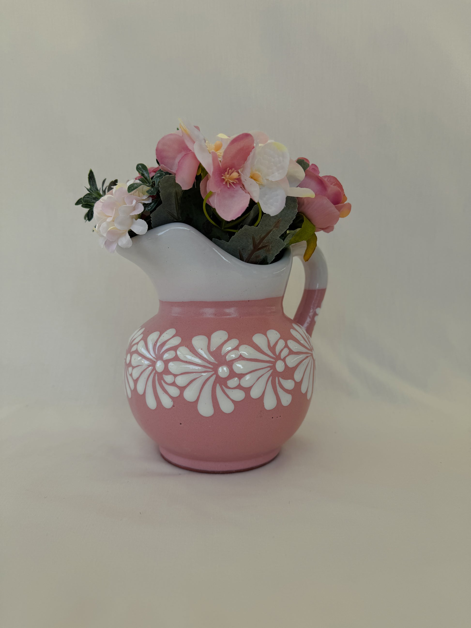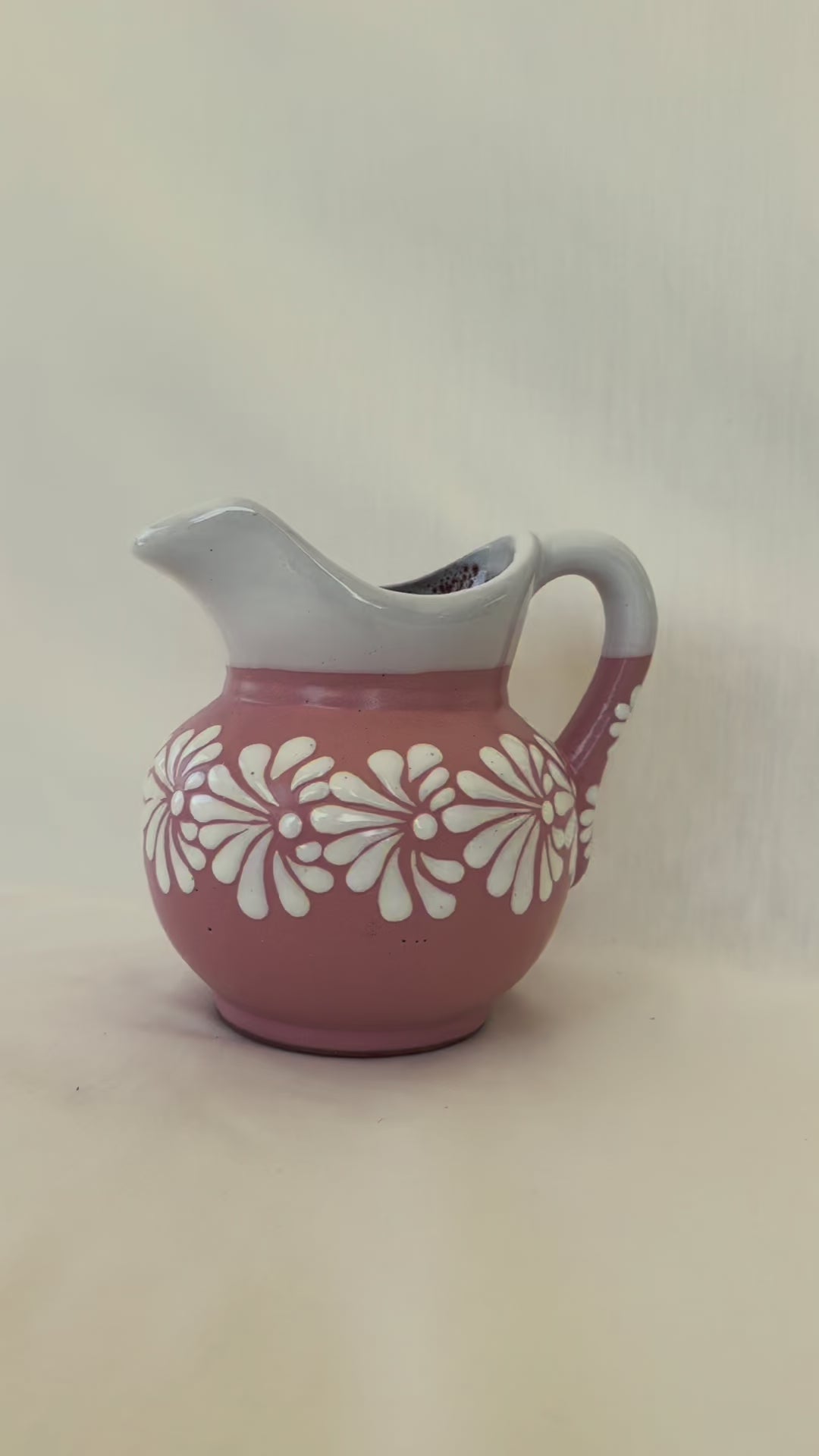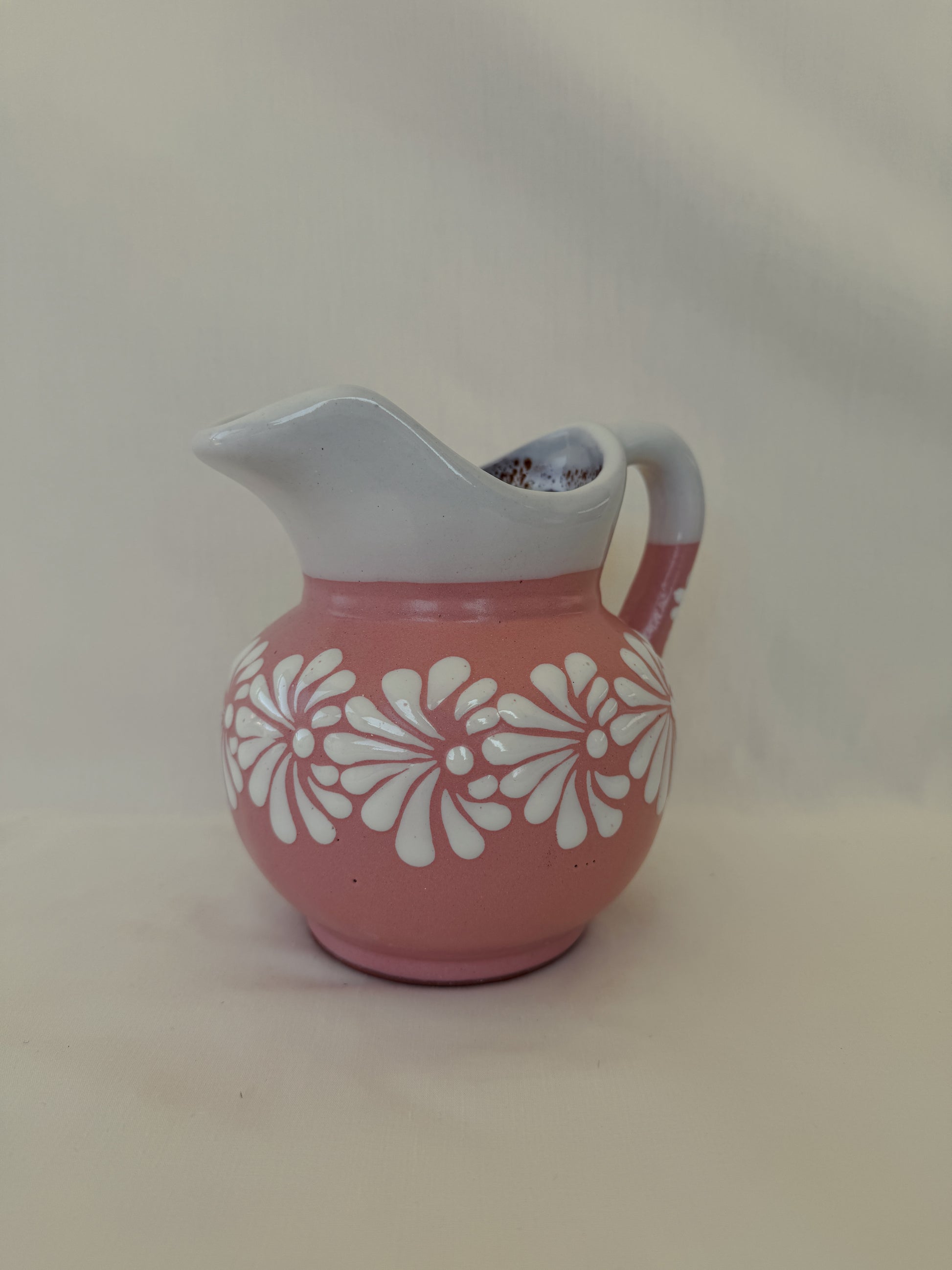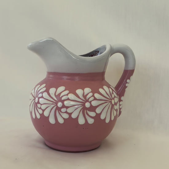 Pink small pitcher with white design. Burst design. White rim. 6 1/2” tall. 6 1/2” wide. Holds 32 fl. oz.