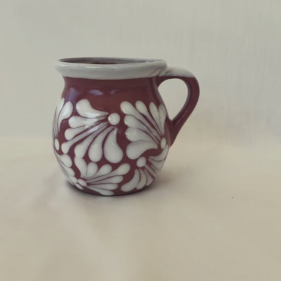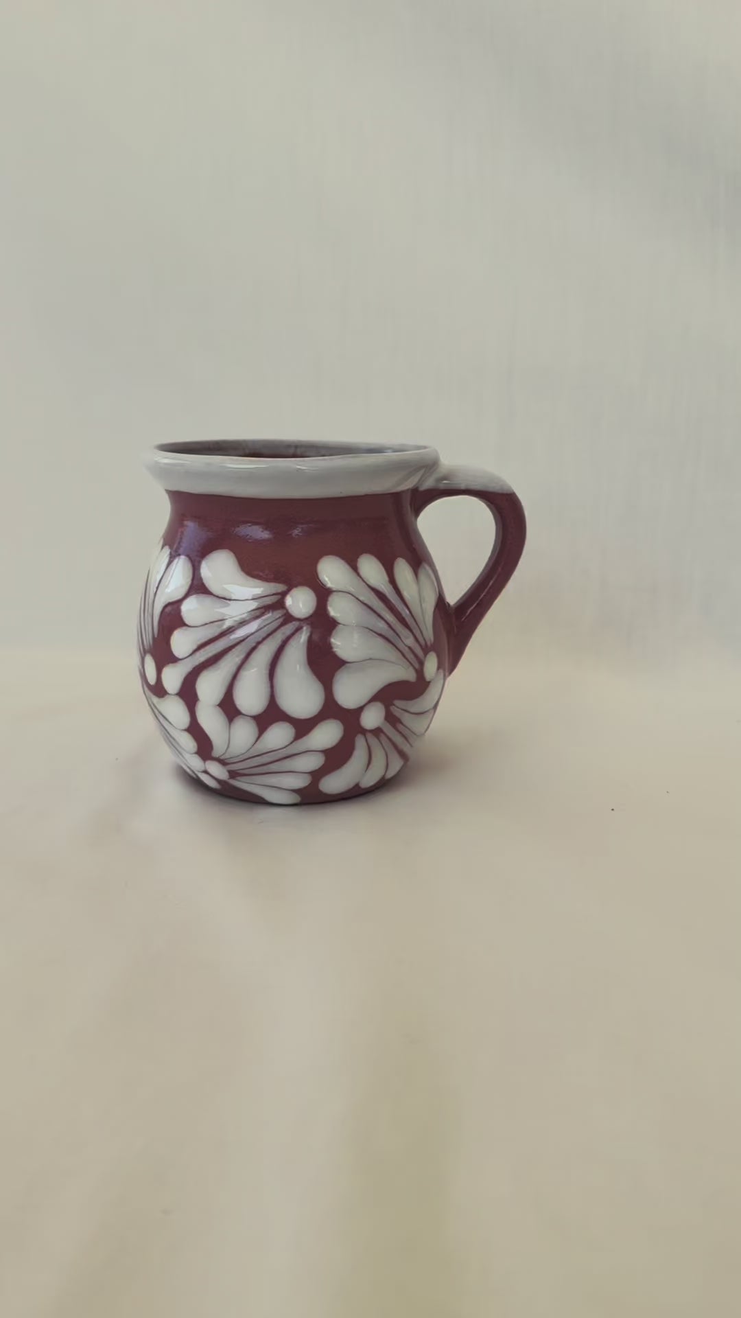 Pink mug with white design. Glossy white rim. Swirl design. 4” tall. Holds 16 fl. oz.