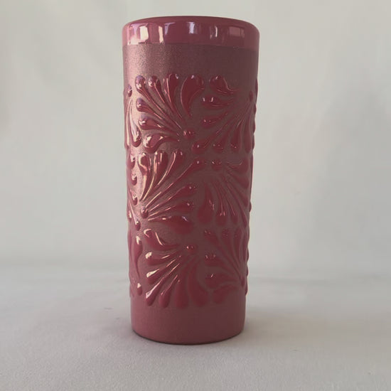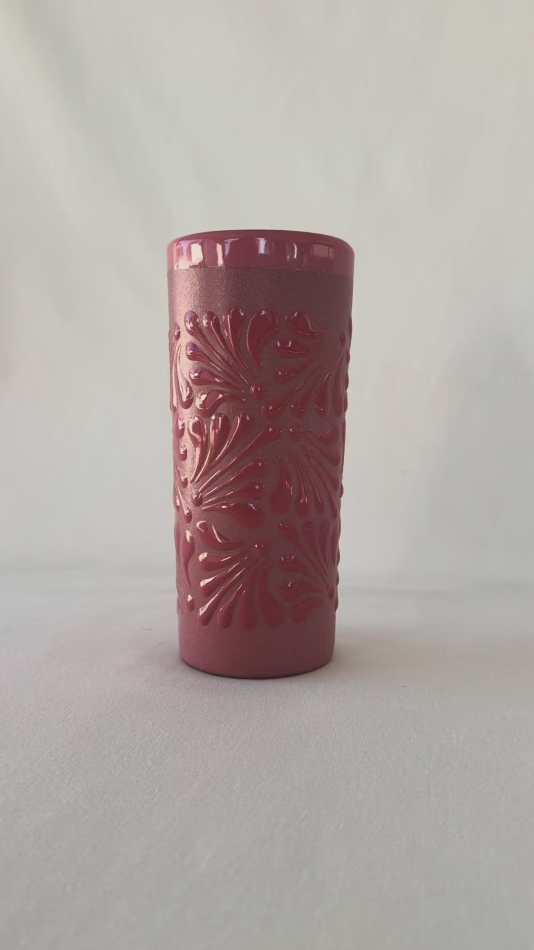 Pink vaso with pink design. Fan design. Glossy pink rim. 7” tall. Holds ~20 fl. oz.