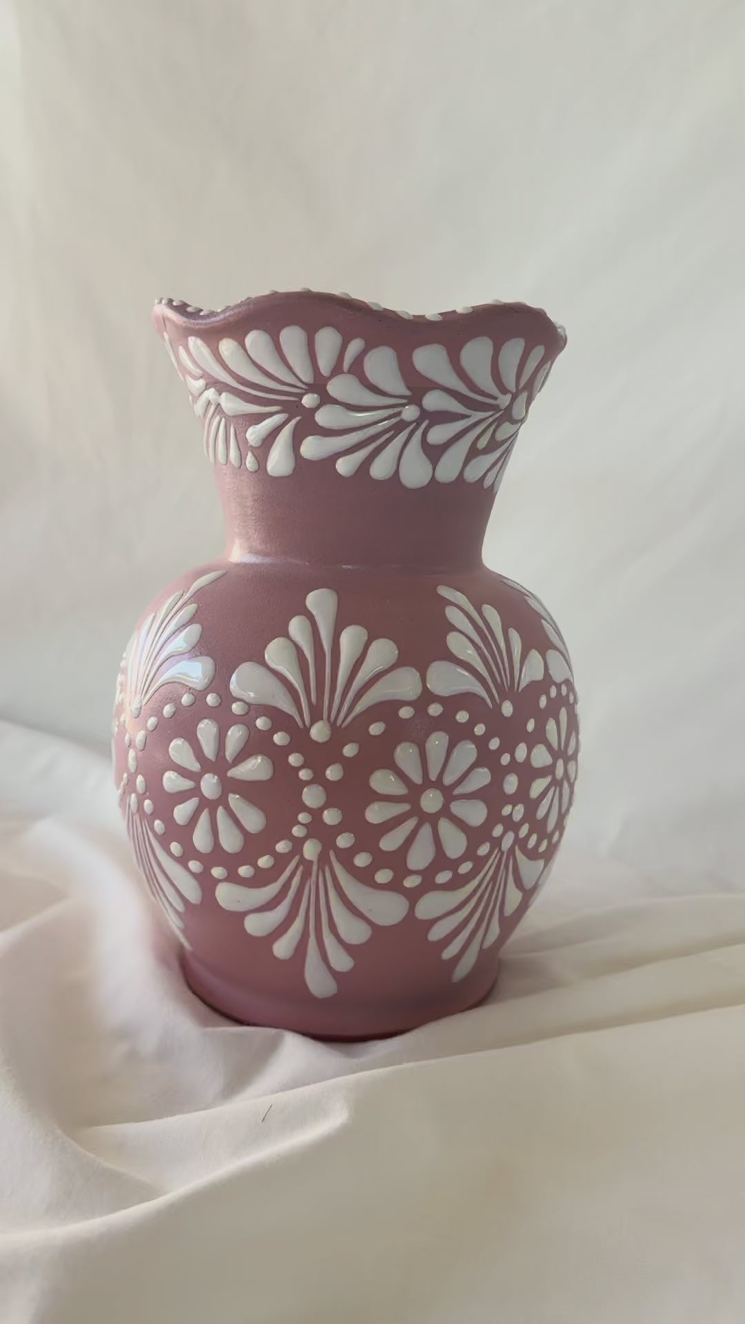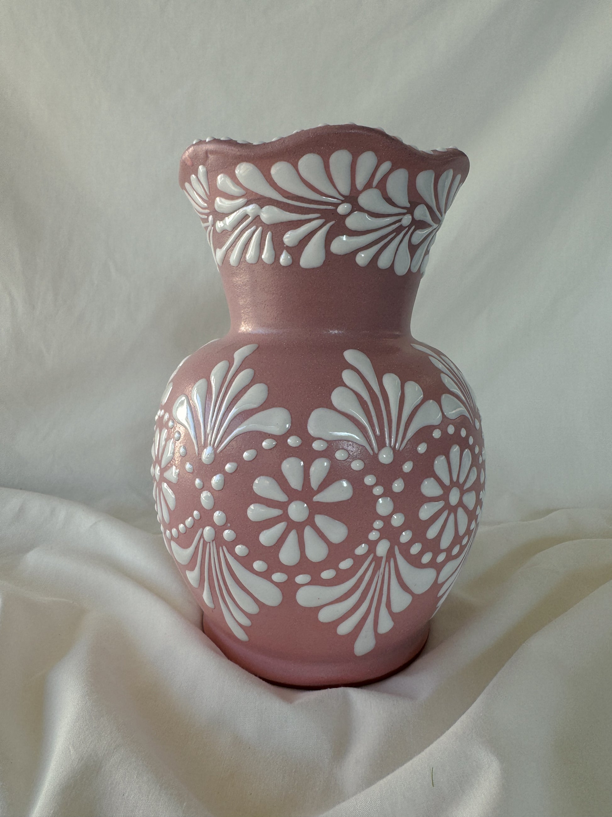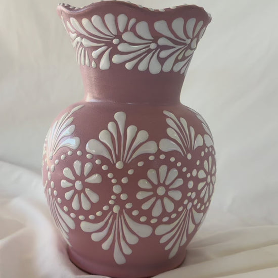 Pink wavy vase with white design. Mix design. Wavy accent rim. 9” tall.