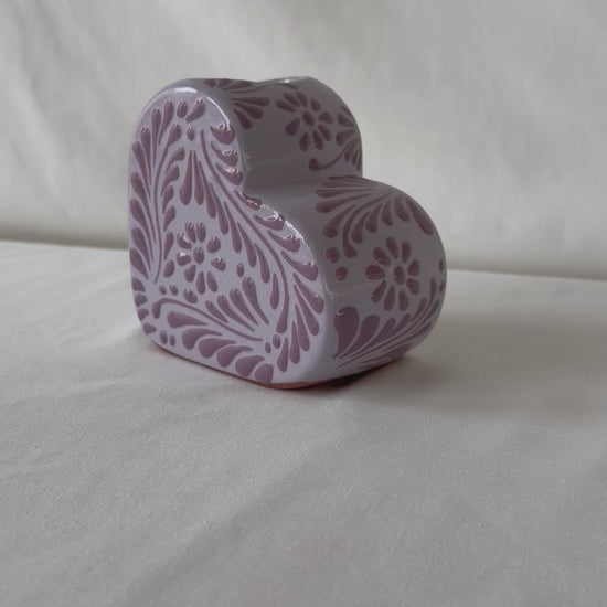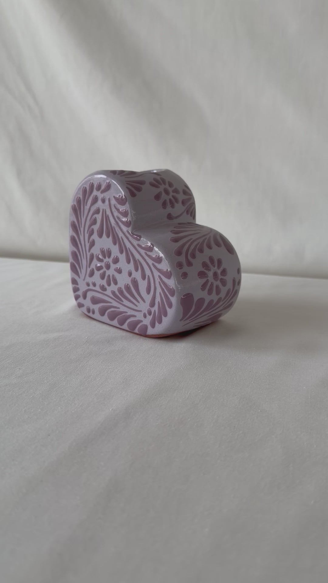 Purple heart vase with dark purple design. Full mix design. 4 1/2” tall. 4 1/2” wide.