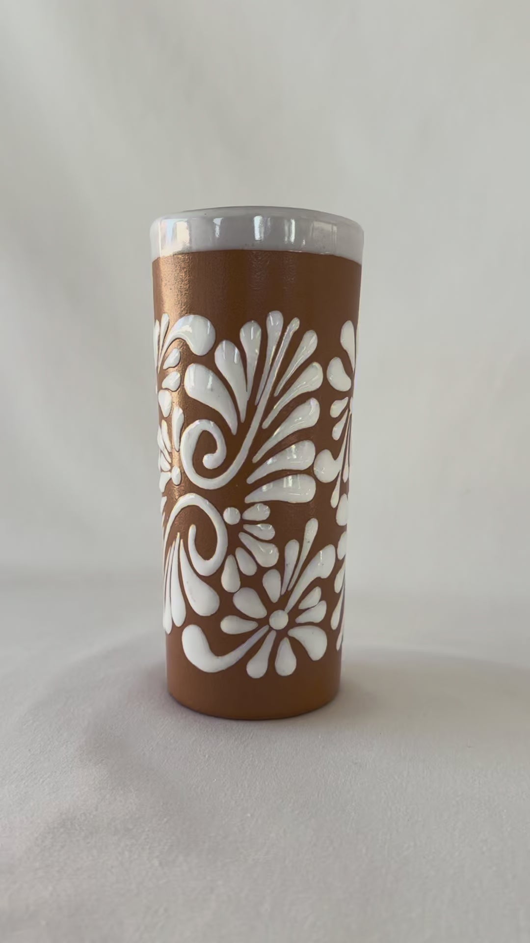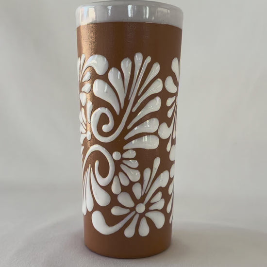 Tan vaso with white design. Swirl design. Glossy white rim. 7” tall. Holds ~20 fl. oz.