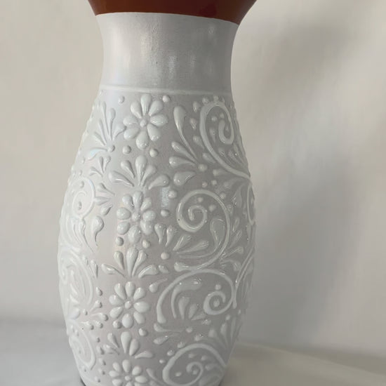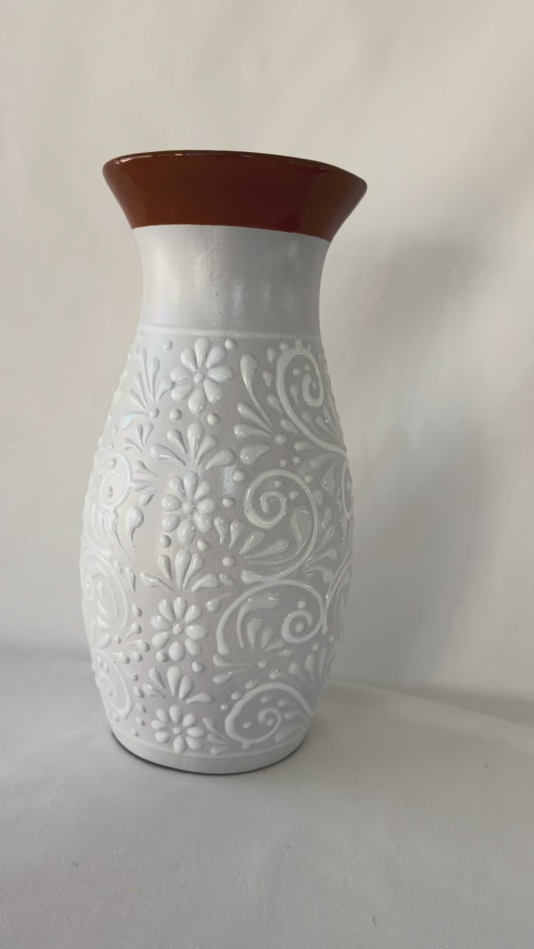 White boliche vase with white design. Mix design. Brown rim. 13” tall.