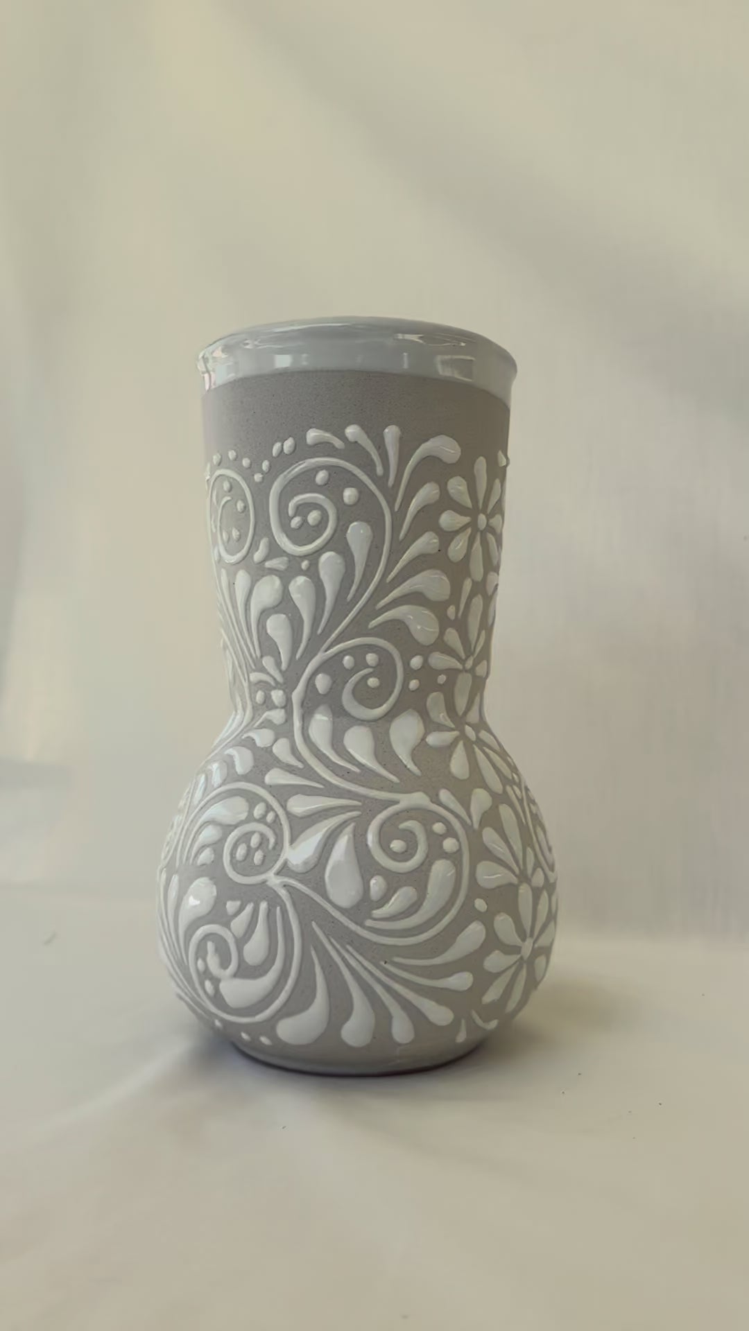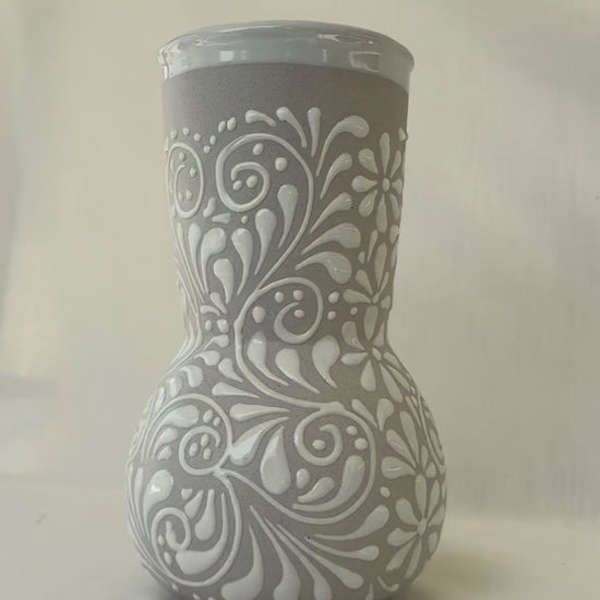 White medium vase with white design. Glossy white rim. Mix design. 9” tall