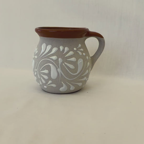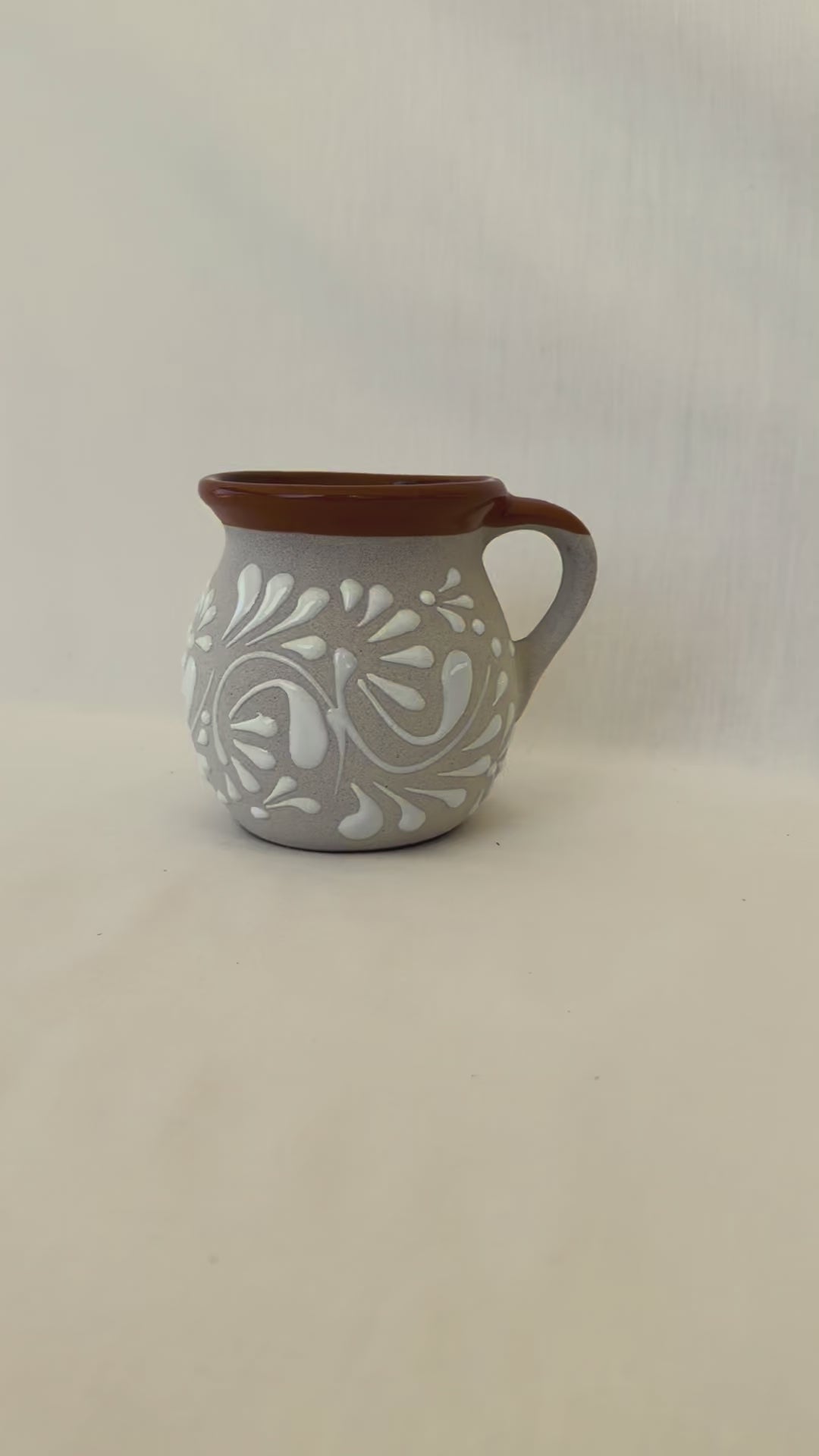 White mug with white design. Brown rim. Swirl design. 4” tall. Holds 16 fl. oz.