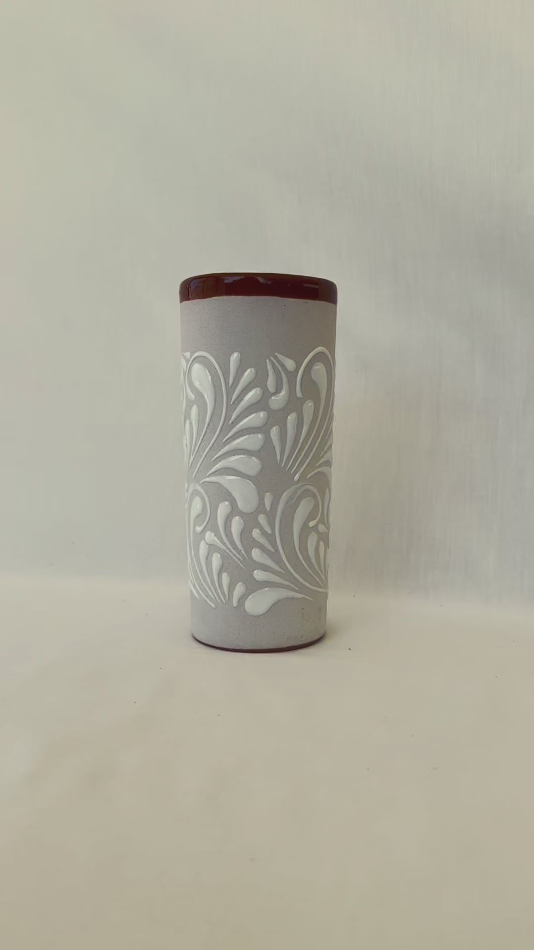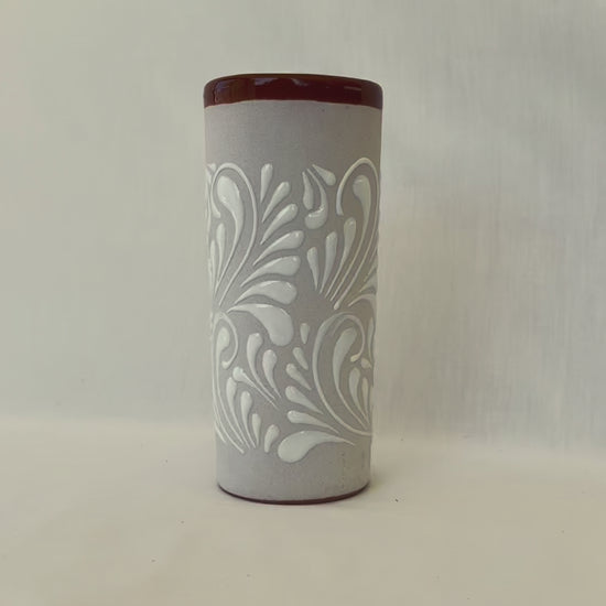 White tall cup with white design. Glossy brown rim. Swirl design. 7” tall. Holds ~20 fl. oz.