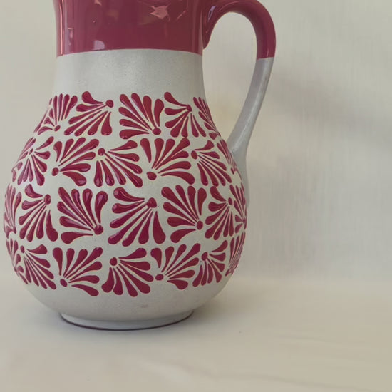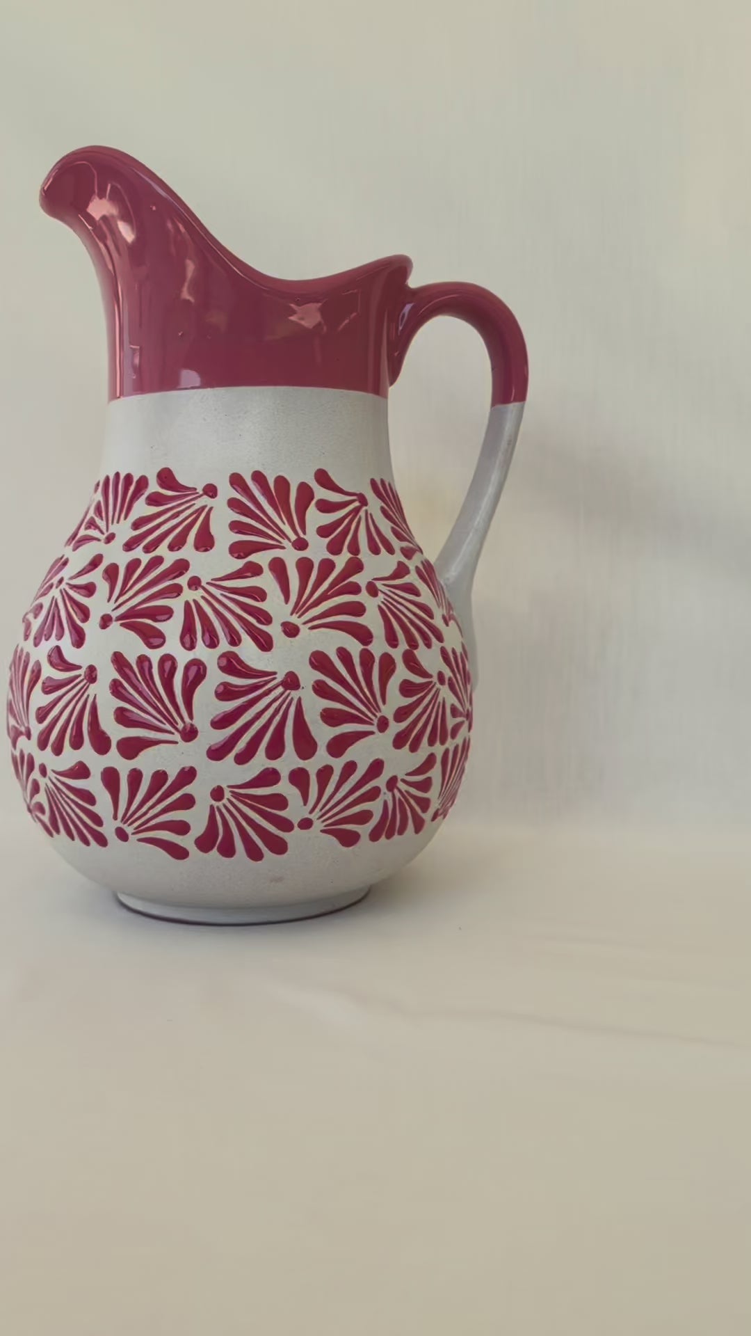 White pitcher with dark pink design. Burst design. Dark pink rim. 11 1/4” tall. Holds 110 fl. oz.